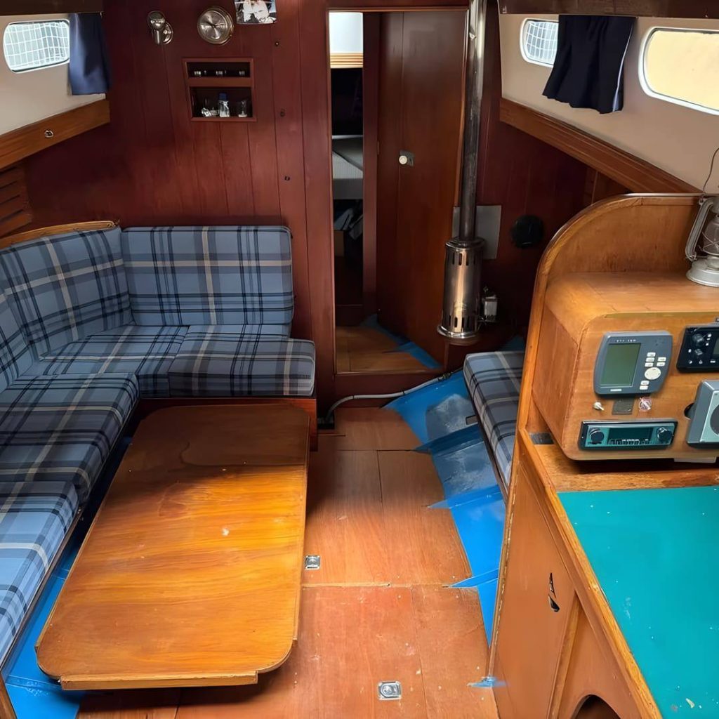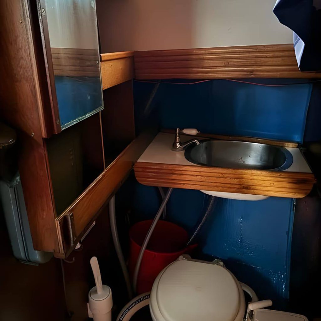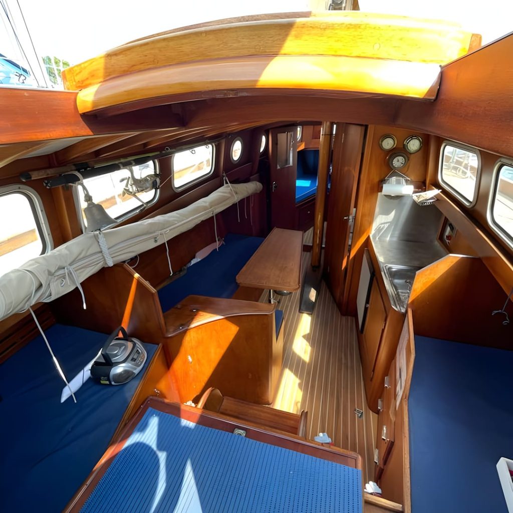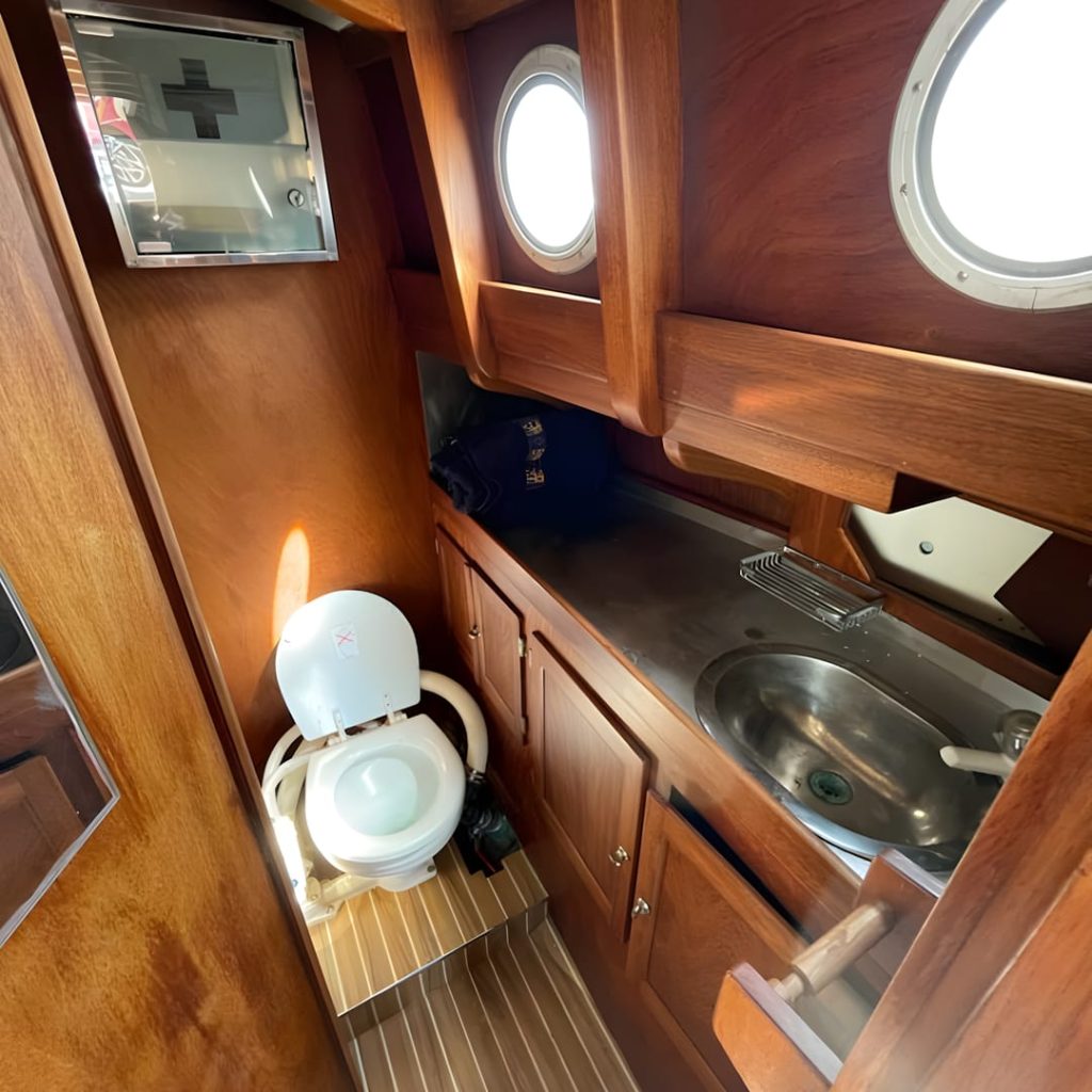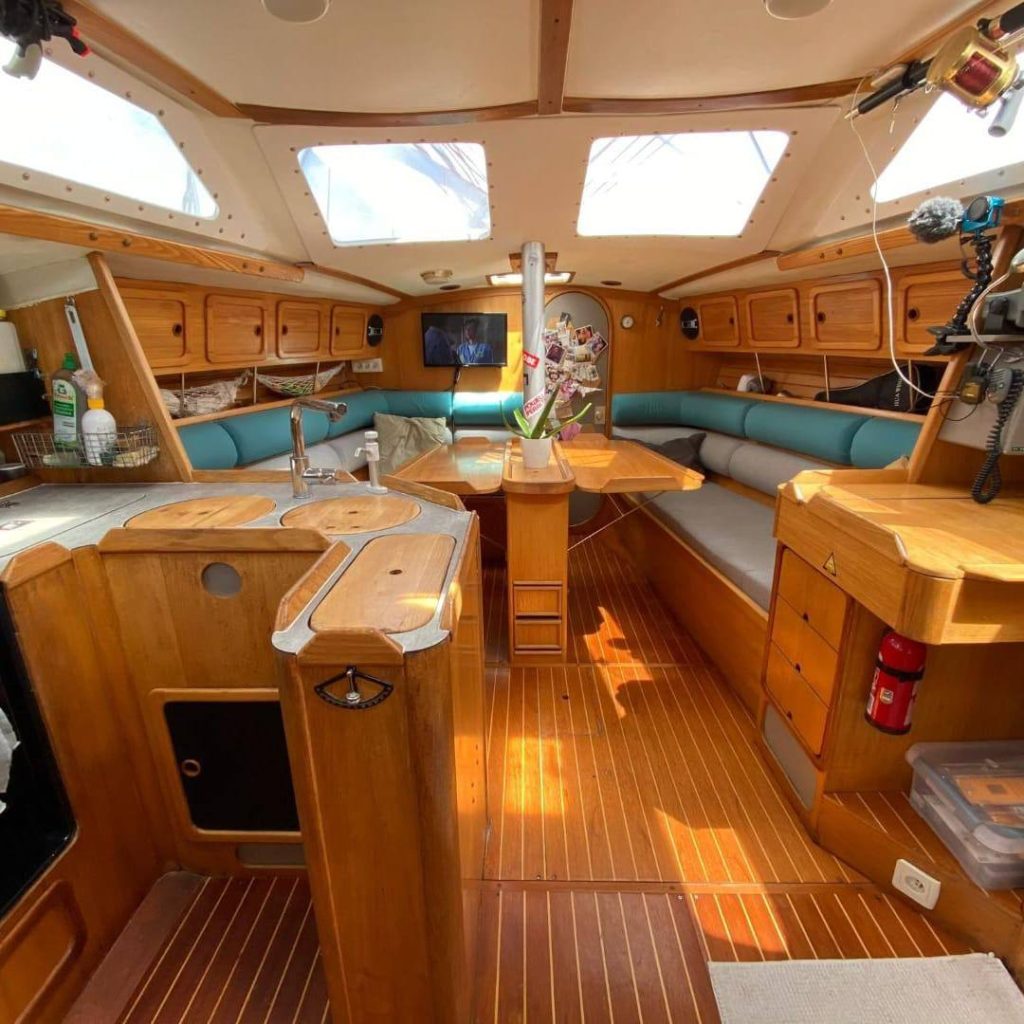 Это редкий, просторный, мореходный и рассчитанный на комфортные длительные переходы мотосейлер. Внутри: отдельная каюта, салон с раскладывающимся столом, камбуз с плитой, духовкой и холодильником, а также полноценный санузел с электрическим туалетом и горячим душем.