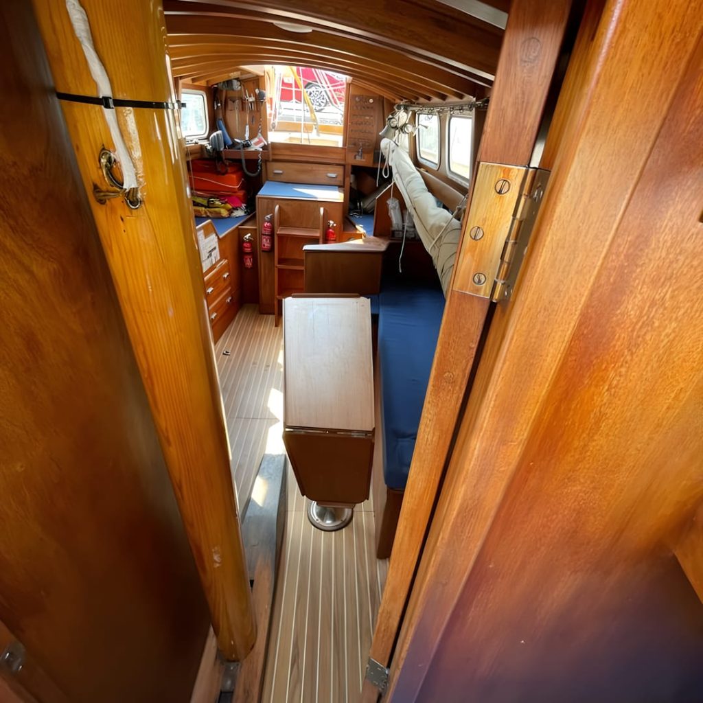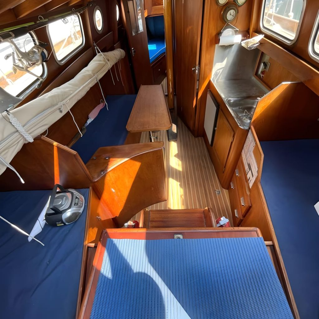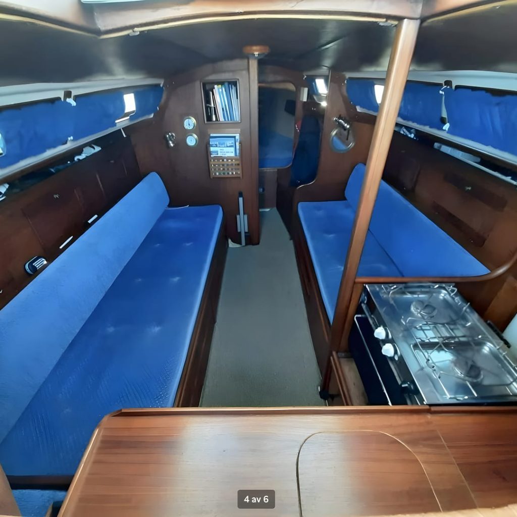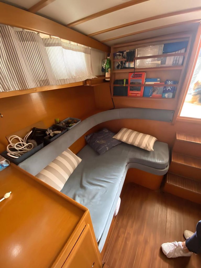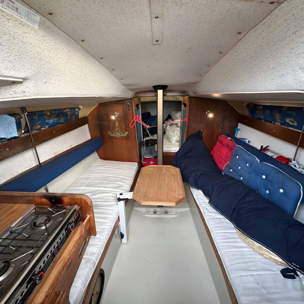 Это редкий, просторный, мореходный и рассчитанный на комфортные длительные переходы мотосейлер. Внутри: отдельная каюта, салон с раскладывающимся столом, камбуз с плитой, духовкой и холодильником, а также полноценный санузел с электрическим туалетом и горячим душем.