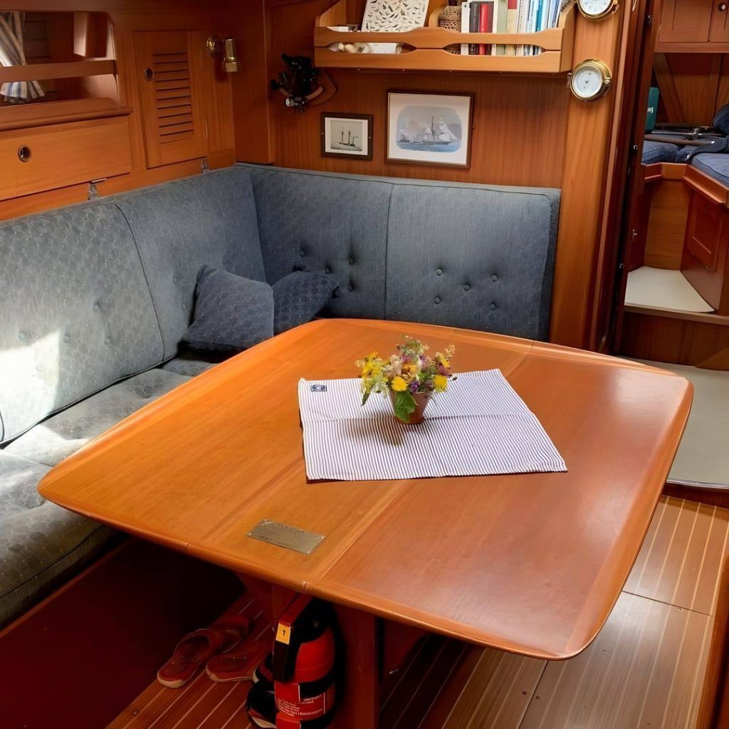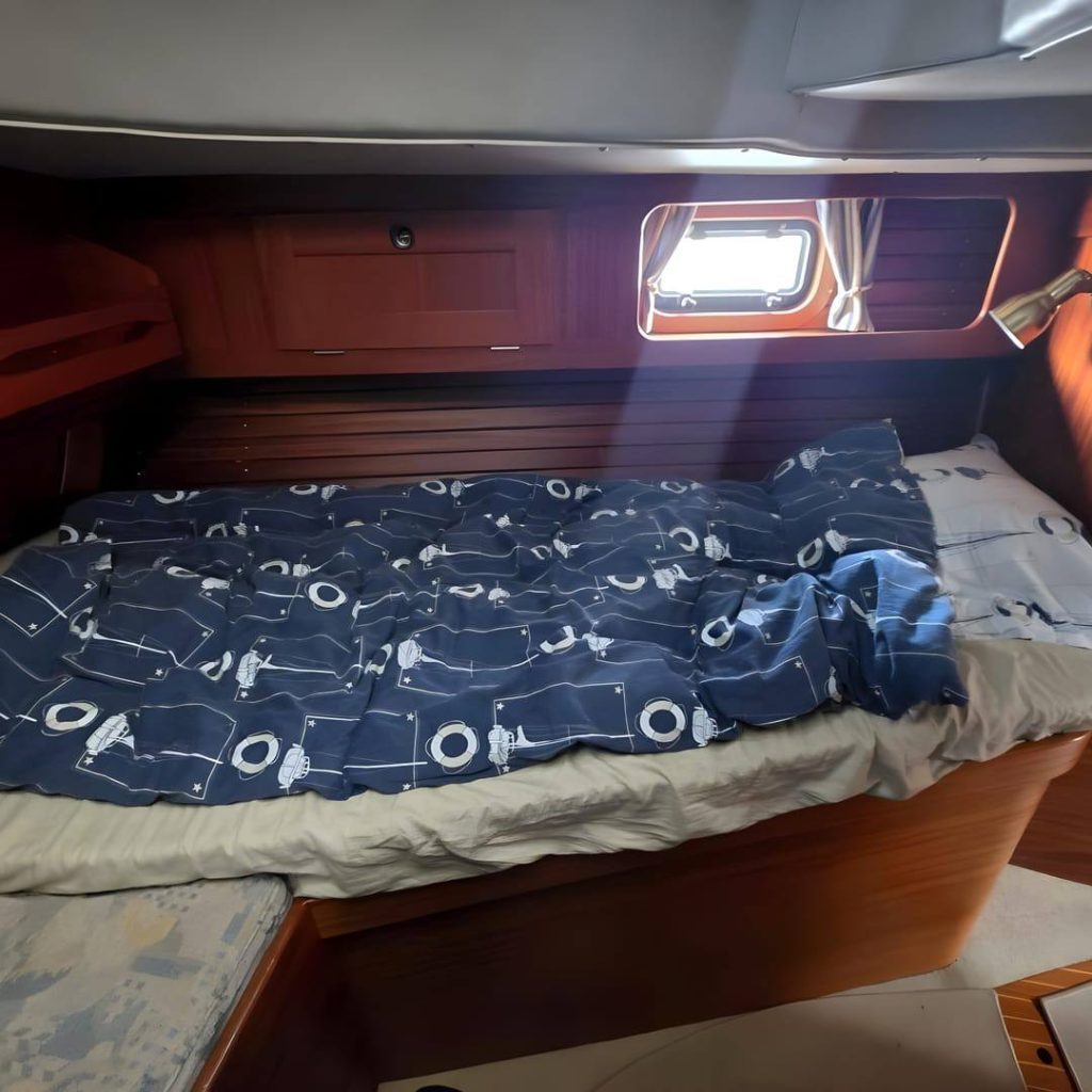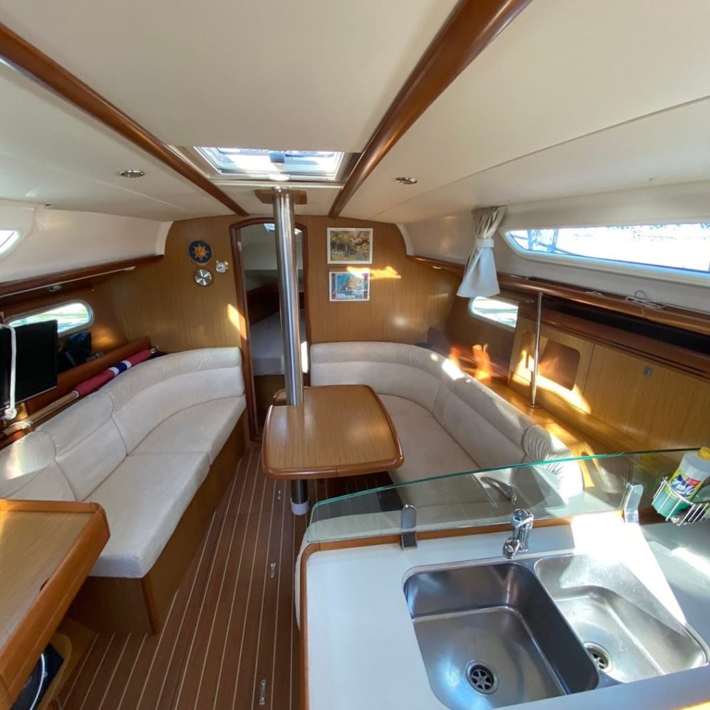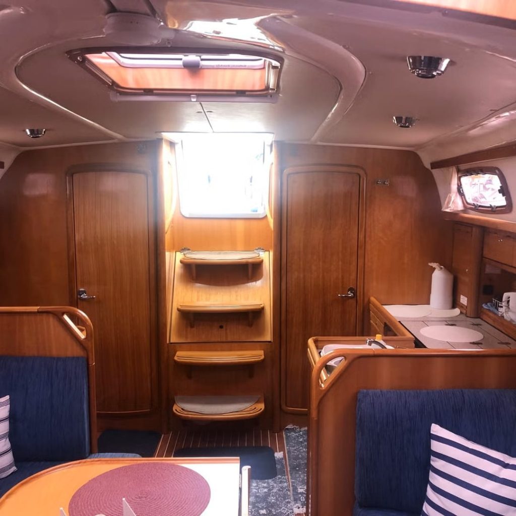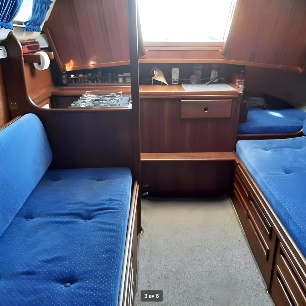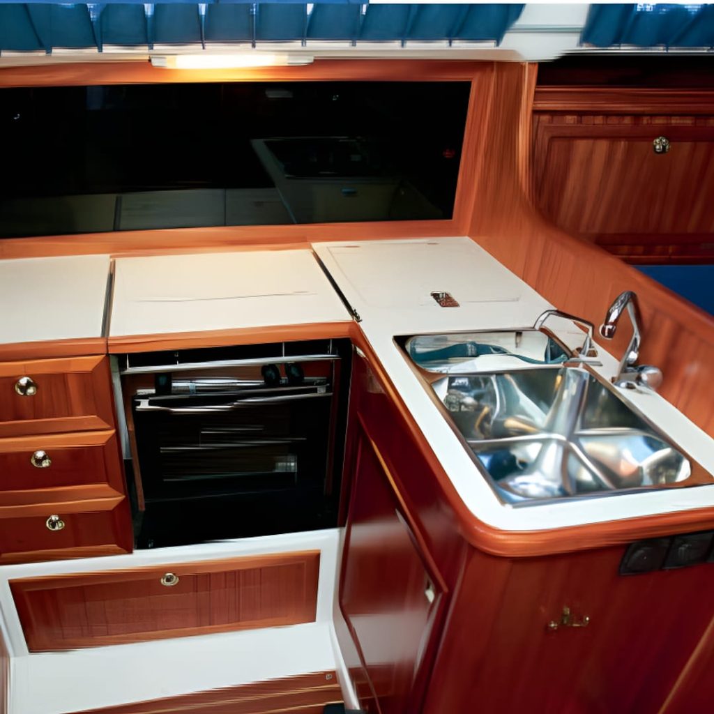 Это редкий, просторный, мореходный и рассчитанный на комфортные длительные переходы мотосейлер. Внутри: отдельная каюта, салон с раскладывающимся столом, камбуз с плитой, духовкой и холодильником, а также полноценный санузел с электрическим туалетом и горячим душем.
