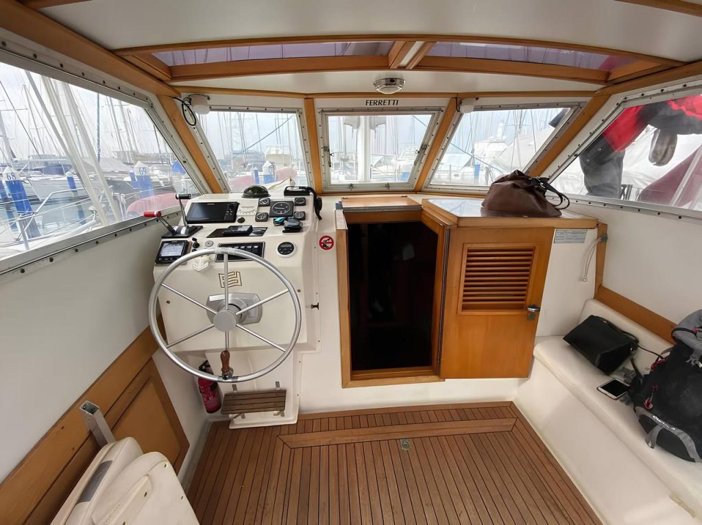 Мощный дизель Iveco Aifo после капитального ремонта работает ровно и уверенно. Управление удобное за счёт гидравлического руля, плюс предусмотрен запасной румпель на случай нештатной ситуации.