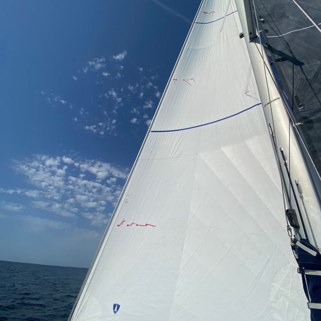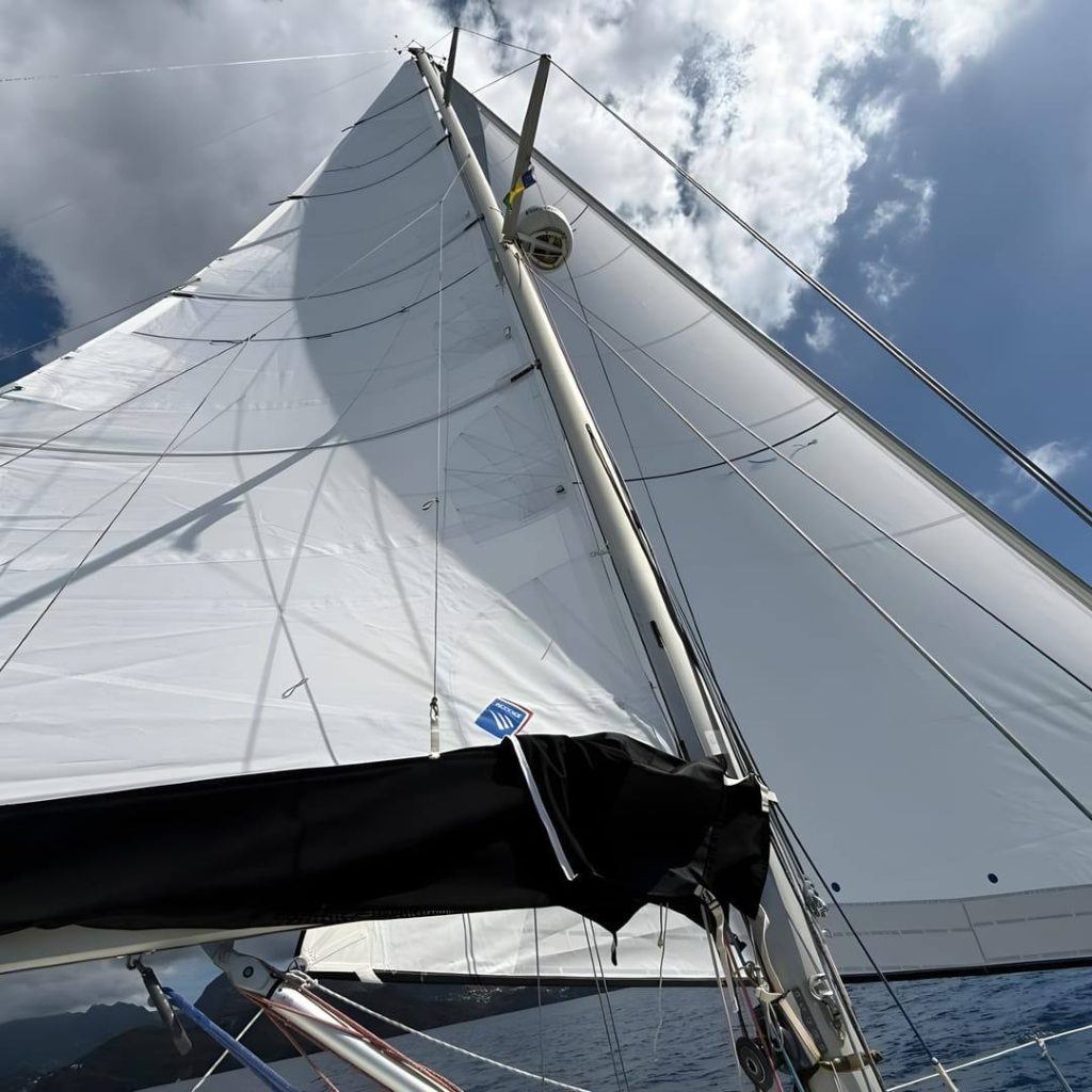 По парусному вооружению лодка тоже укомплектована достойно: грот, генуя на закрутке, чехол для грота, Lazy Jack, вся бегучка — обновлённая. Мачта проходила обслуживание с покраской и заменой кабелей.