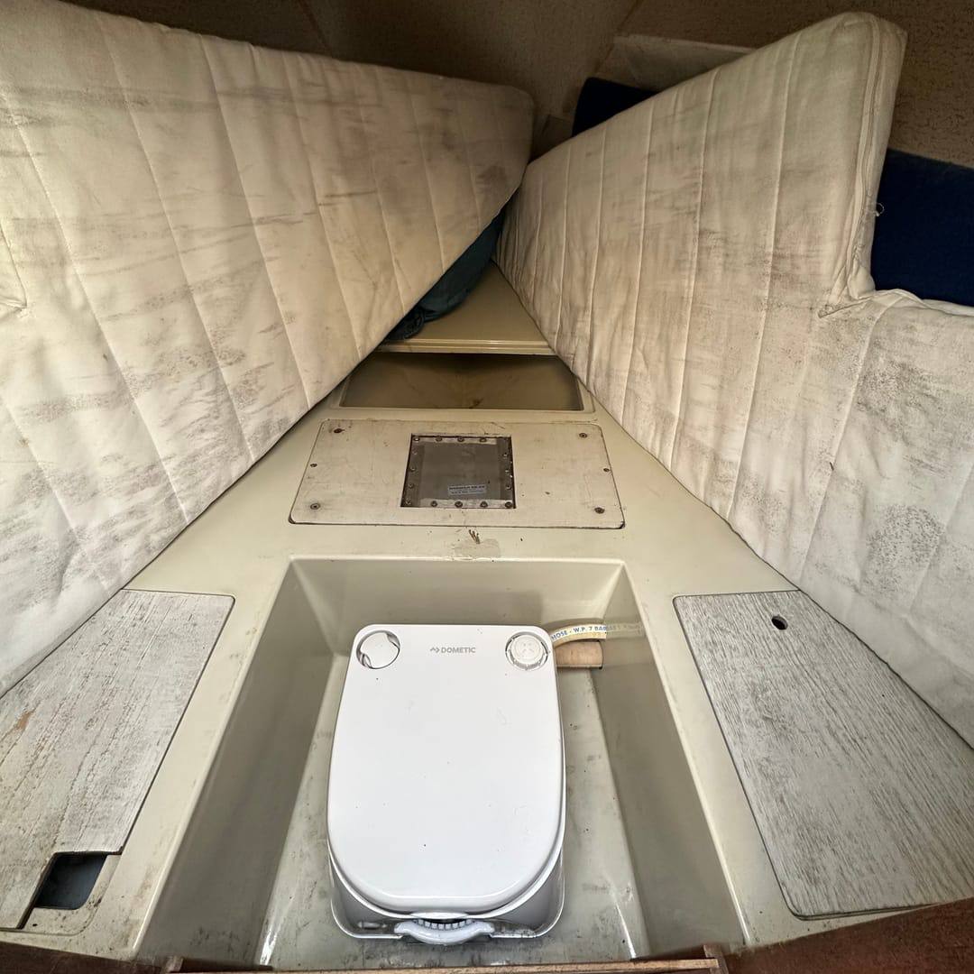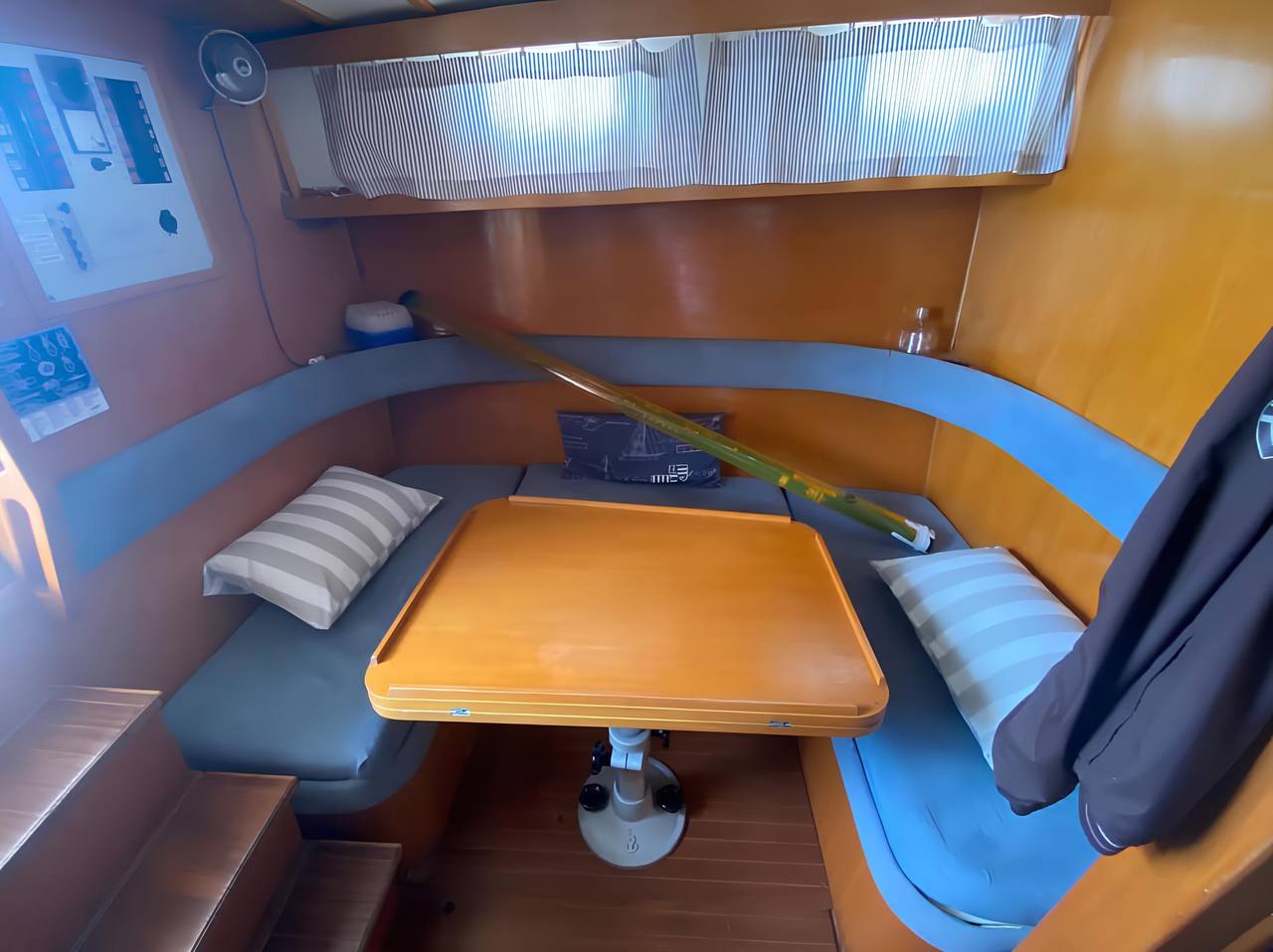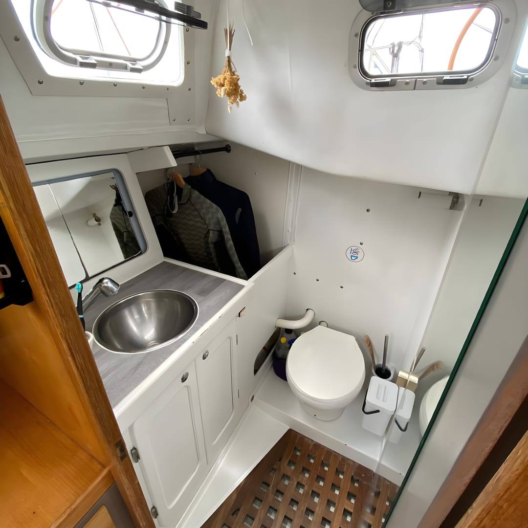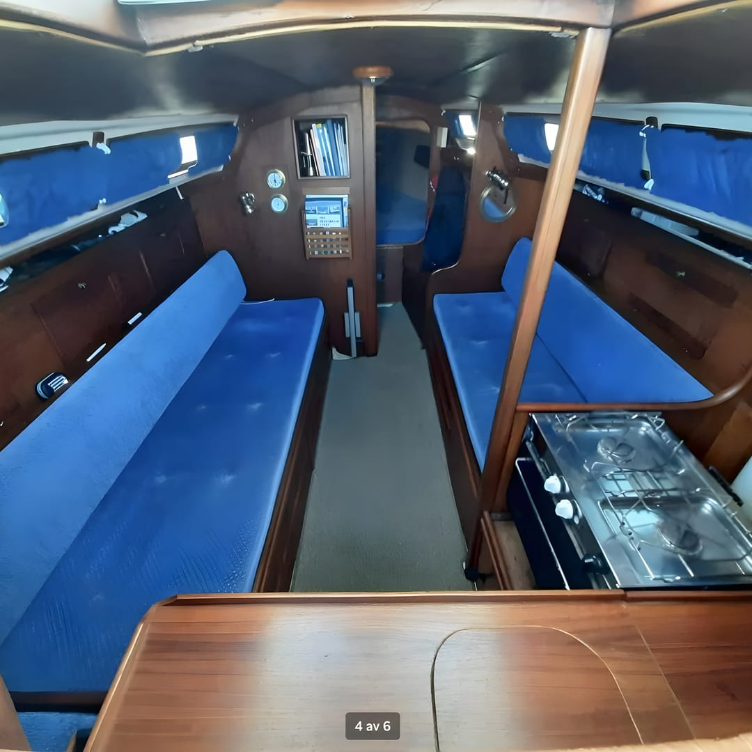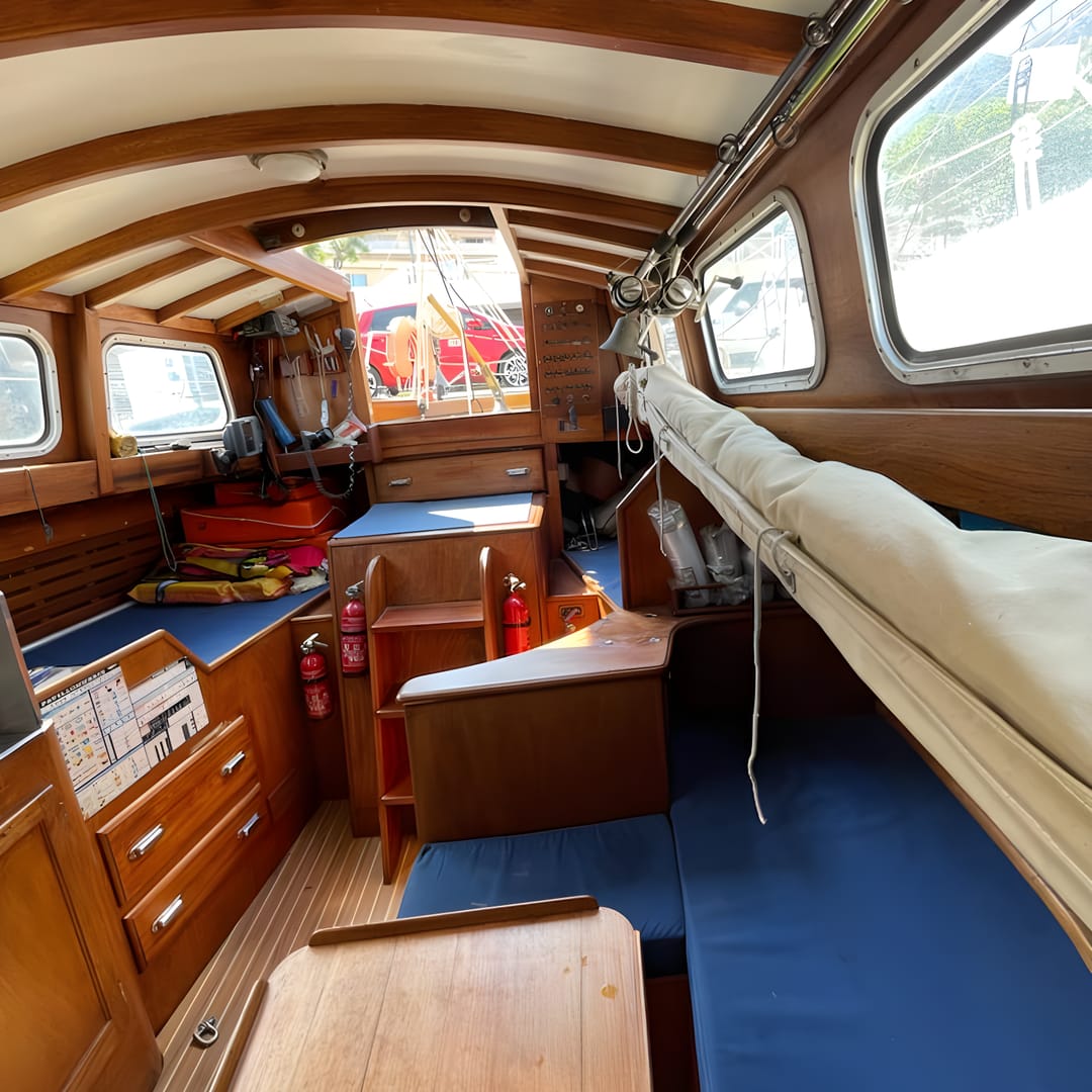 Это редкий, просторный, мореходный и рассчитанный на комфортные длительные переходы мотосейлер. Внутри: отдельная каюта, салон с раскладывающимся столом, камбуз с плитой, духовкой и холодильником, а также полноценный санузел с электрическим туалетом и горячим душем.