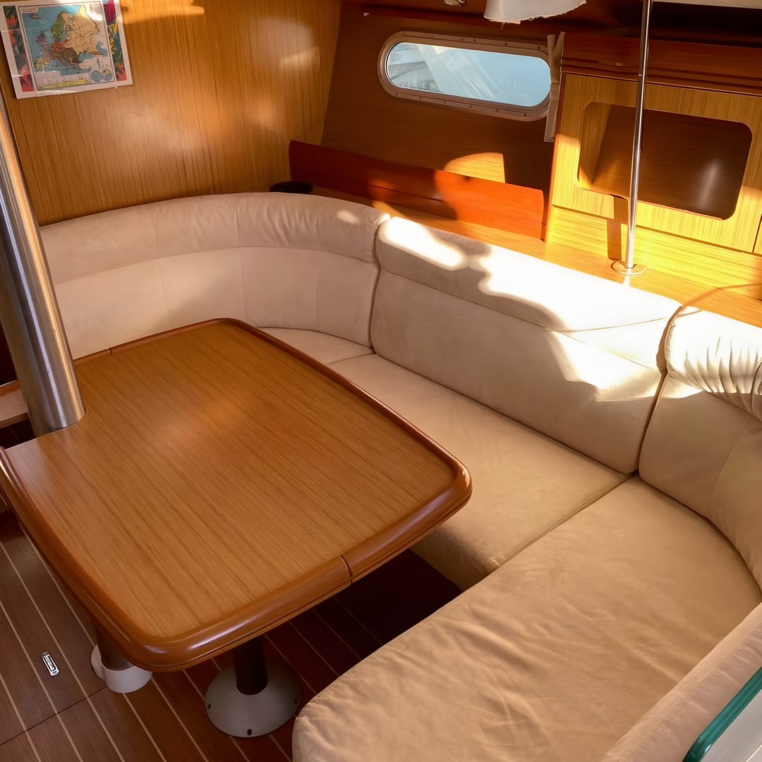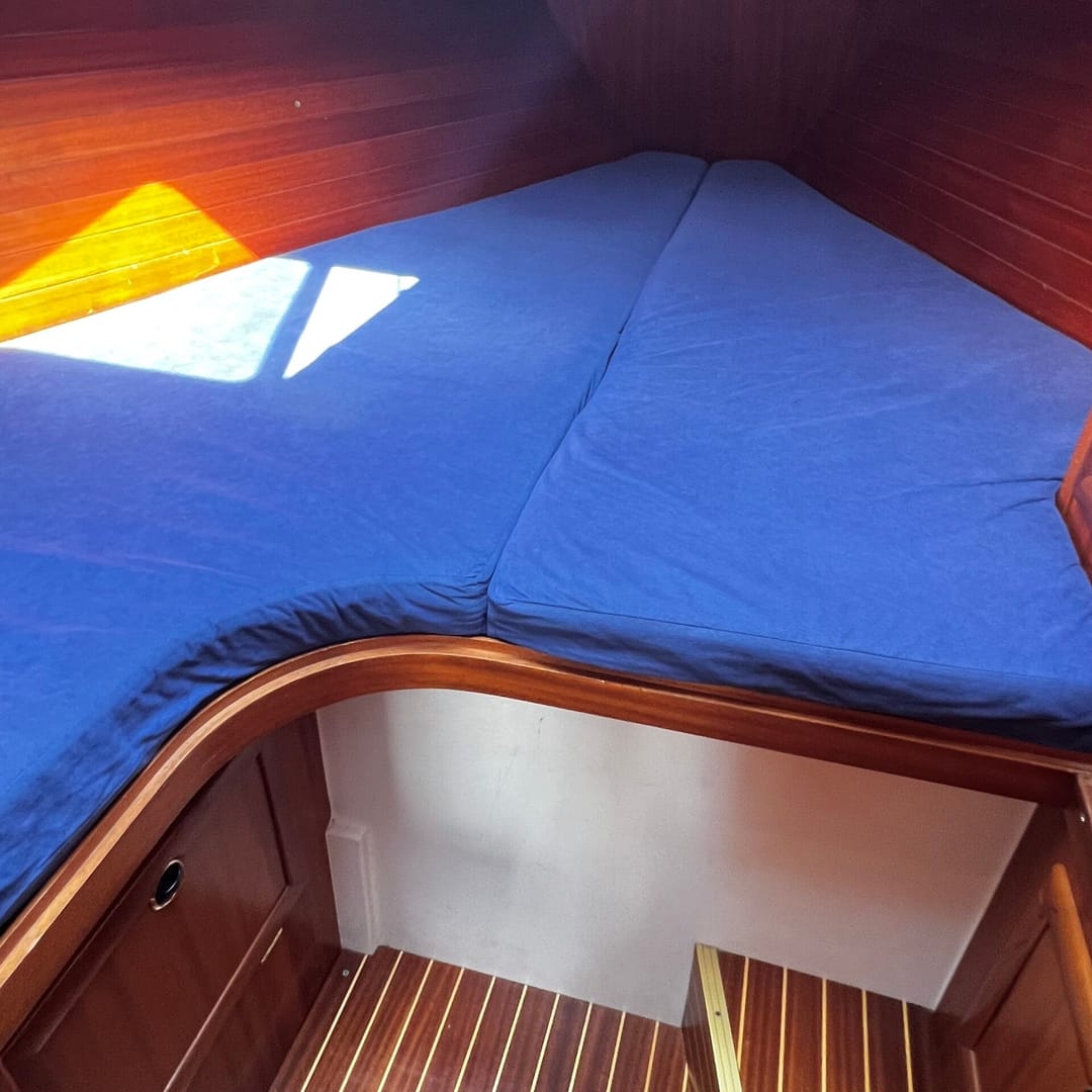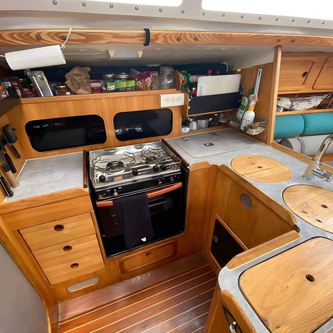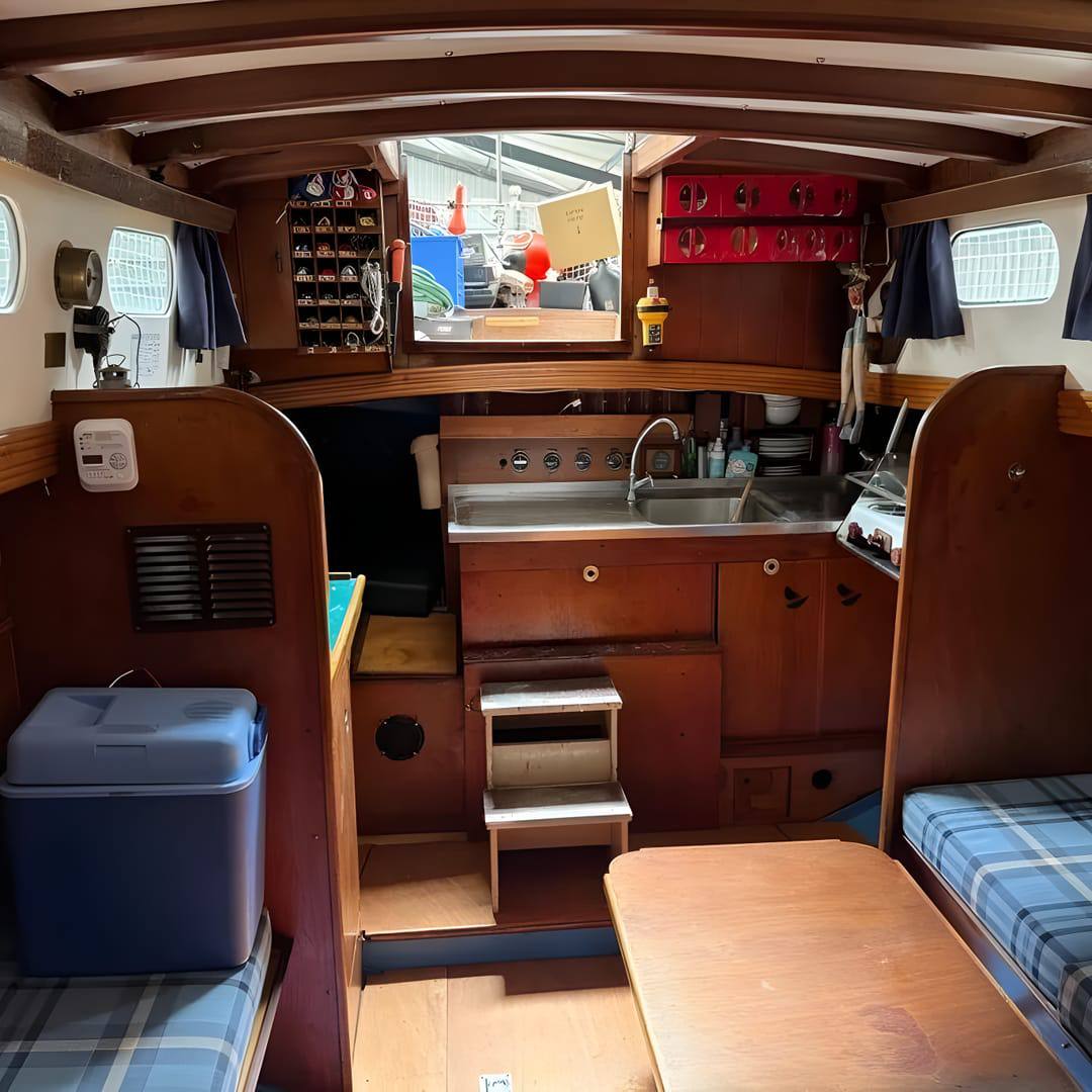 Это редкий, просторный, мореходный и рассчитанный на комфортные длительные переходы мотосейлер. Внутри: отдельная каюта, салон с раскладывающимся столом, камбуз с плитой, духовкой и холодильником, а также полноценный санузел с электрическим туалетом и горячим душем.