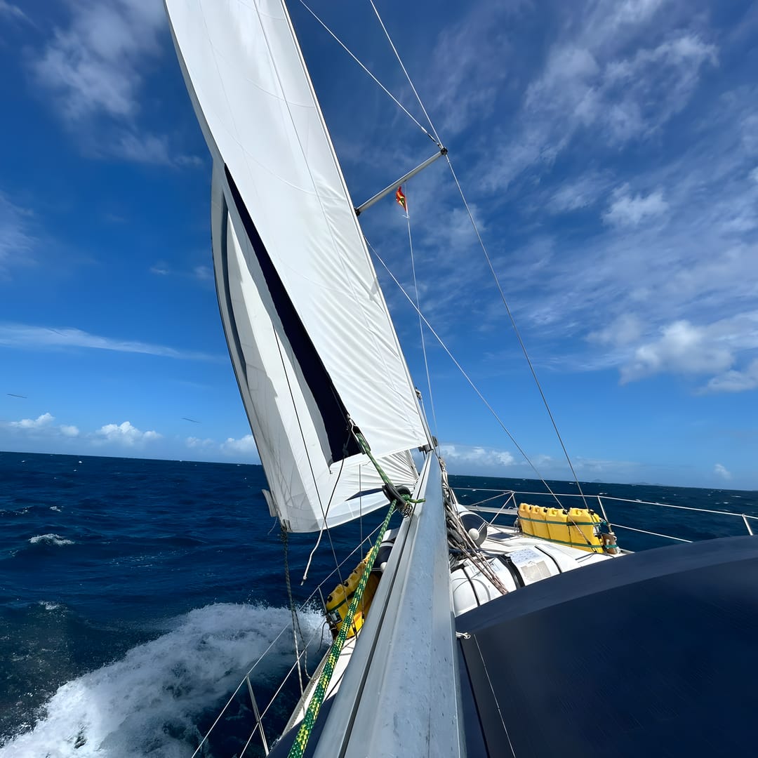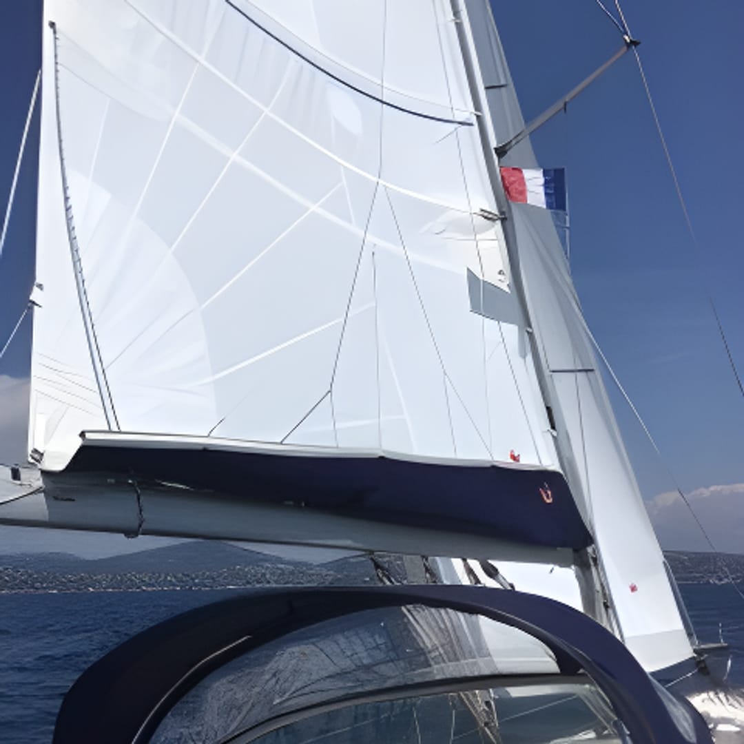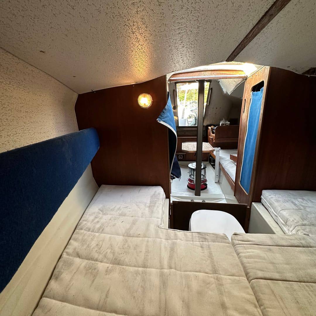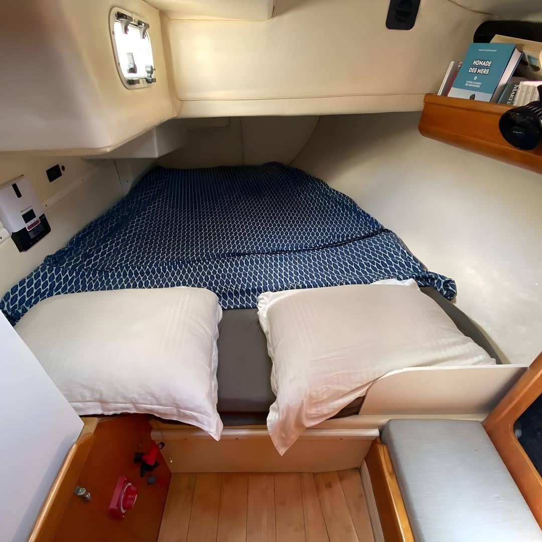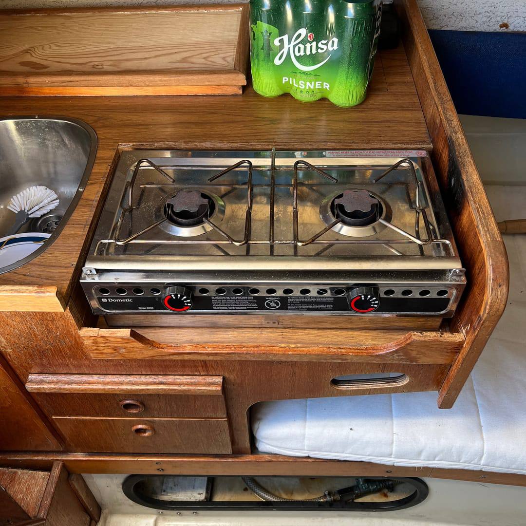 Это редкий, просторный, мореходный и рассчитанный на комфортные длительные переходы мотосейлер. Внутри: отдельная каюта, салон с раскладывающимся столом, камбуз с плитой, духовкой и холодильником, а также полноценный санузел с электрическим туалетом и горячим душем.
