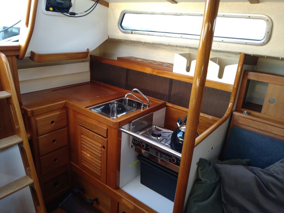 Камбуз оборудован плитой на подвесе, двумя раковинами с пресной и забортной водой и холодильной камерой. В салоне есть обогреватель. Новый туалет Jabsco.