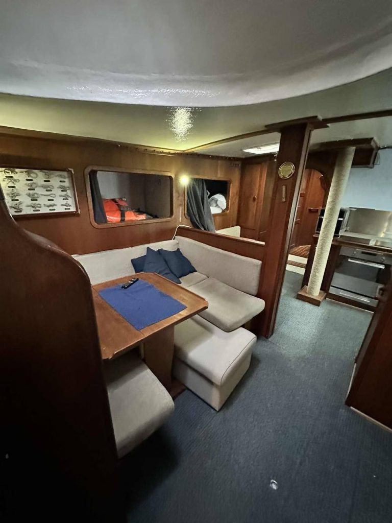Планировка рассчитана на долгие автономные переходы: 9 полноценных спальных мест, просторный салон, отдельная прачечная, полностью оборудованная кухня с индукционной плитой и духовым шкафом. Есть отдельная навигационная зона и рабочий стол.