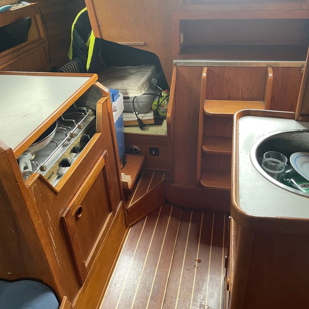 Планировка классическая: салон с диванами, просторная носовая каюта, гальюн с окном, камбуз с плитой и раковиной. Вчетвером разместиться — не тесно.
