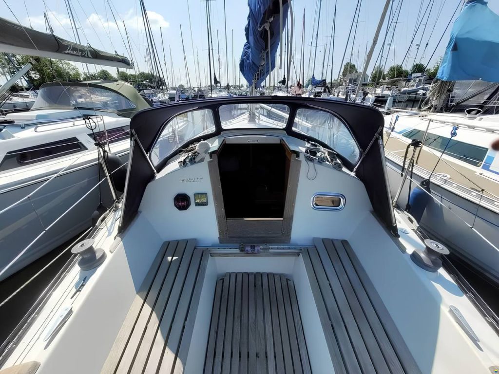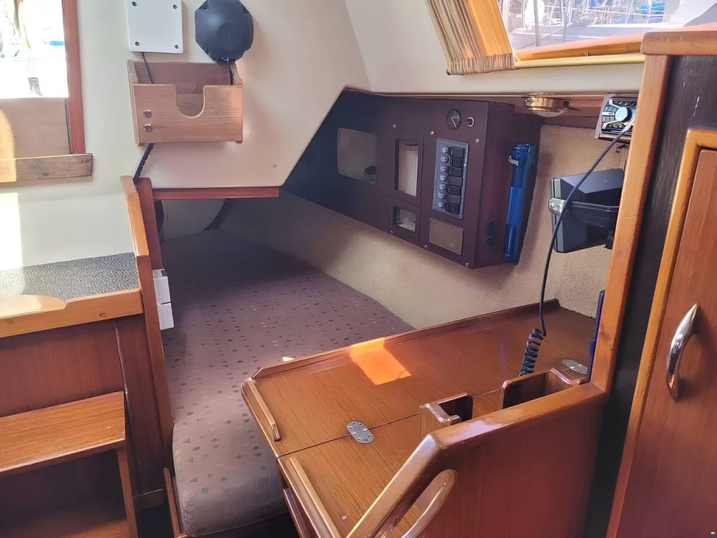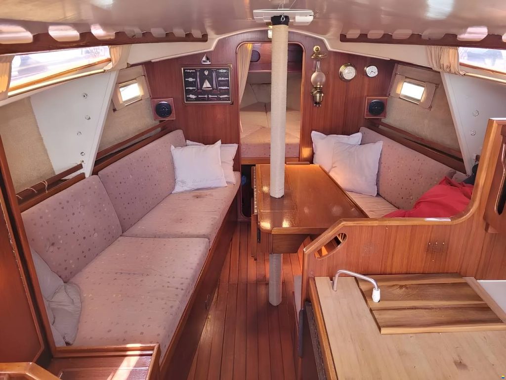 Внутри — уютный классический интерьер с салоном и камбузом, одной каютой и спальными местами на пятерых. Высота потолка 1,80 м. Есть отопление Webasto, что делает возможным комфортное плавание даже в прохладные месяцы.