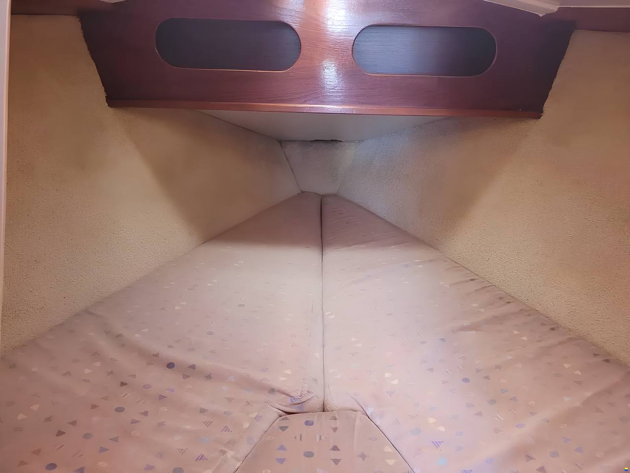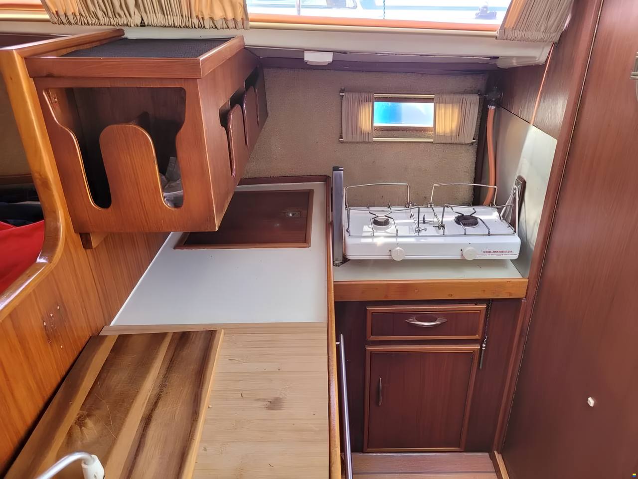 Внутри — уютный классический интерьер с салоном и камбузом, одной каютой и спальными местами на пятерых. Высота потолка 1,80 м. Есть отопление Webasto, что делает возможным комфортное плавание даже в прохладные месяцы.