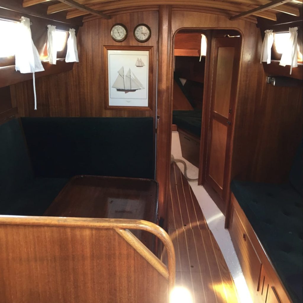 В интерьере Vindö 40 — тёплое дерево, а палуба, уложенная тиком, придаёт лодке приятный, классический вид. Высота под потолком 1,8 метра, обеденная зона и каюты рассчитаны на шестерых. Обратите внимание на состояние дерева: оно выглядит аккуратно, без потертостей, подушки выглядят довольно свежими.