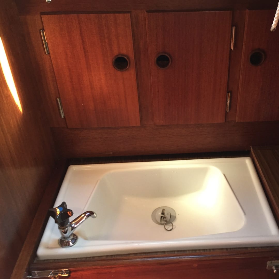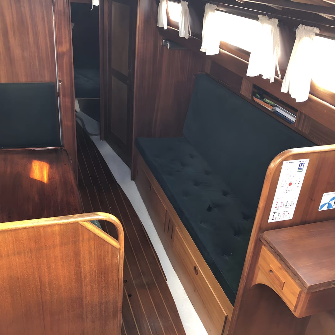 В интерьере Vindö 40 — тёплое дерево, а палуба, уложенная тиком, придаёт лодке приятный, классический вид. Высота под потолком 1,8 метра, обеденная зона и каюты рассчитаны на шестерых. Обратите внимание на состояние дерева: оно выглядит аккуратно, без потертостей, подушки выглядят довольно свежими.