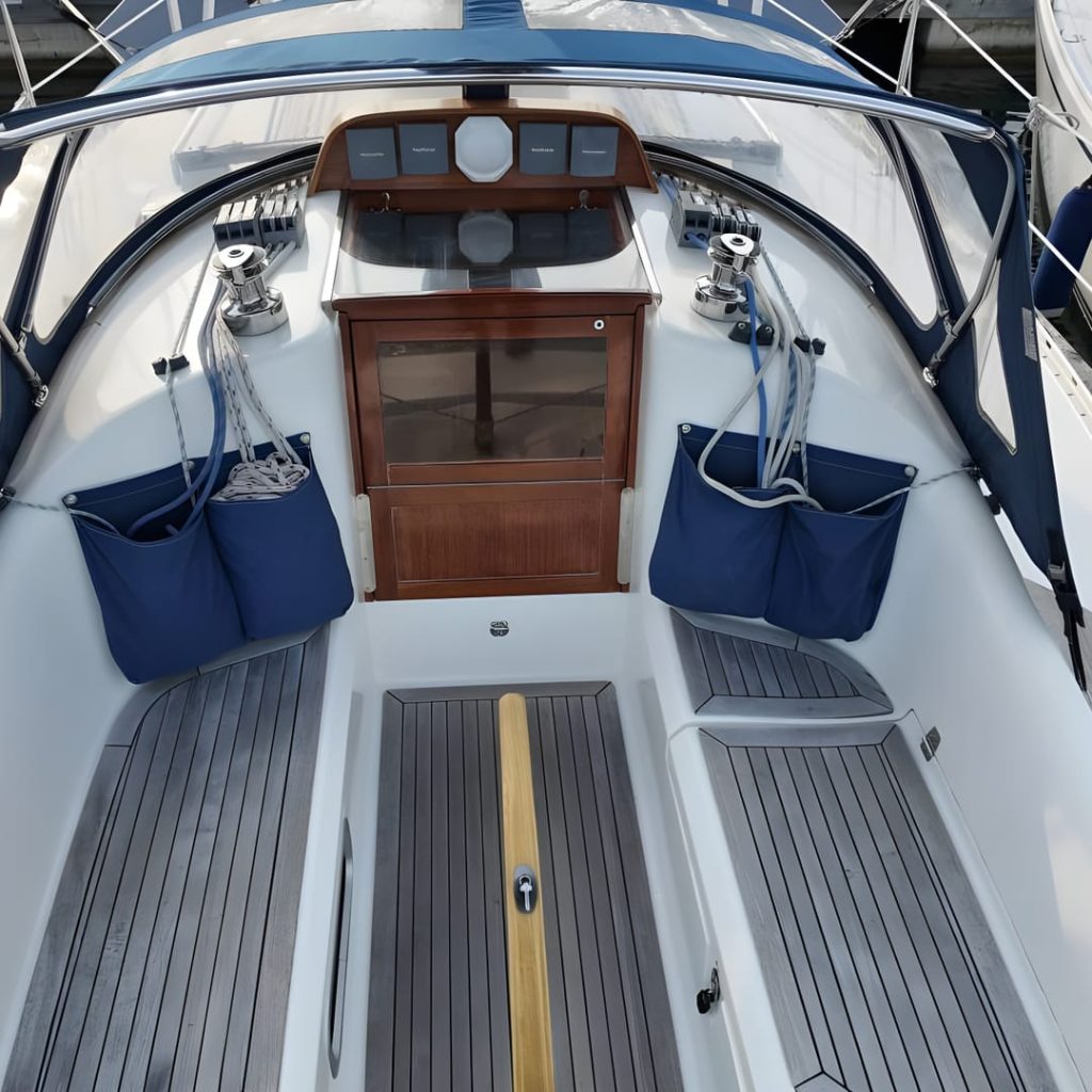 Парусное вооружение — фракционный шлюп с гротом на латах, несколько генуй, спинакеры для разных условий и закрутка Furlex. Такой комплект делает лодку универсальной как для дневных прогулок, так и для дальних переходов.