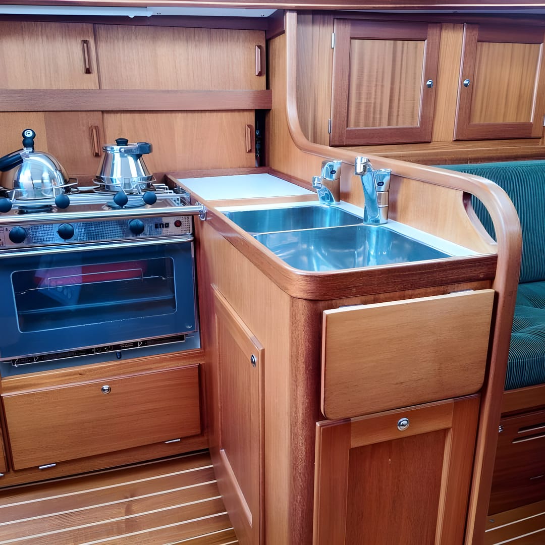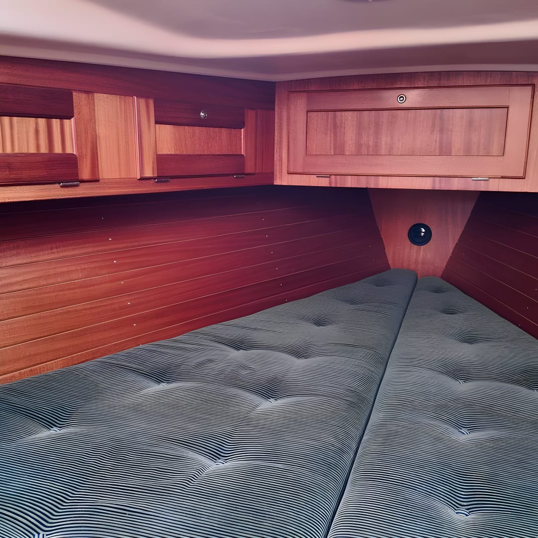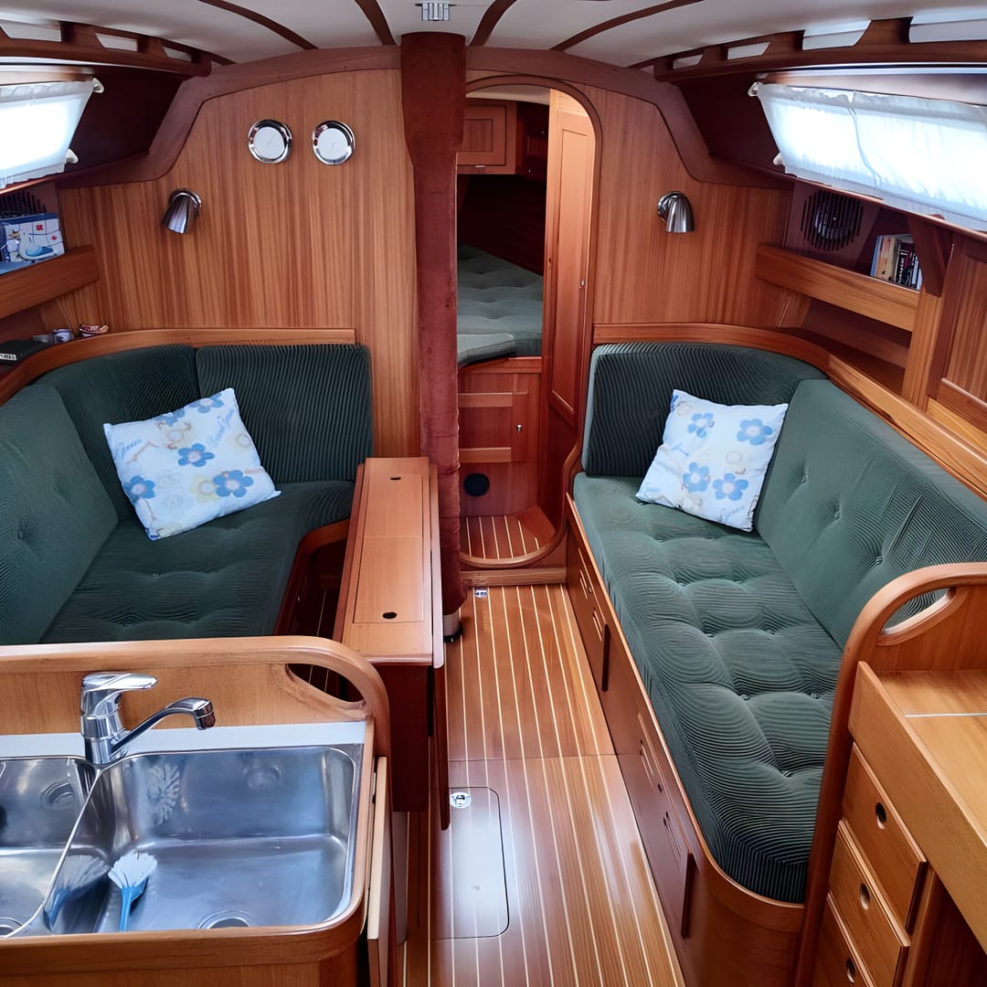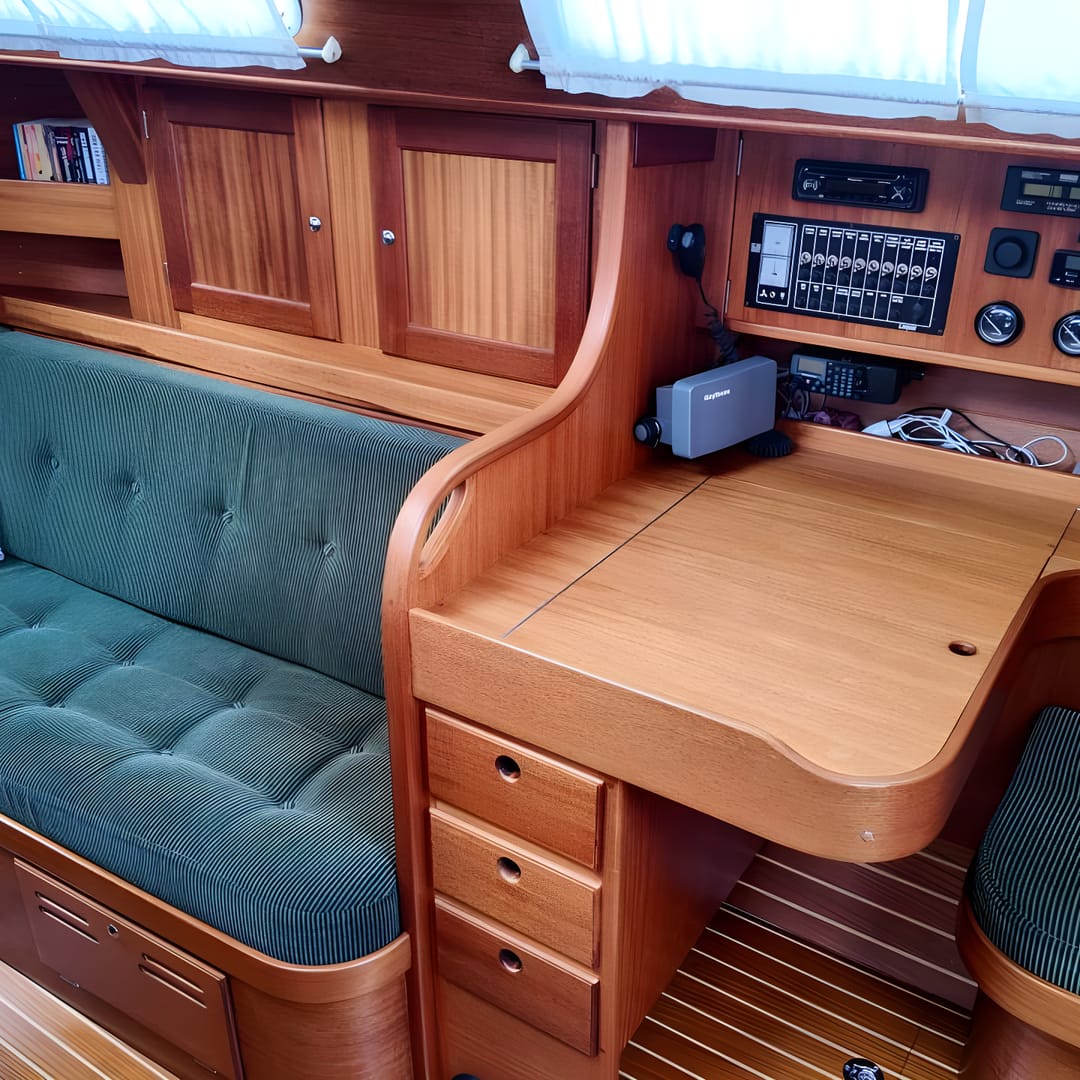 Внутри — классическое планировочное решение с двумя каютами и просторным салоном. Кухня удобная, много шкафчиков, есть полноценный навигационный стол. Деревянная отделка в отличном состоянии, всё выглядит свежо.