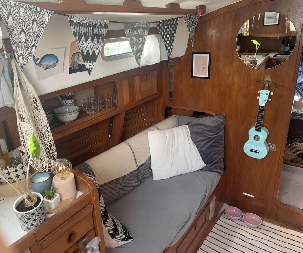 Интерьер чистый и уютный: просторный салон с обеденной зоной, камбуз с газовой плитой и холодильником и частично выделенным туалетом. Всё продумано для комфортных выходов на воду и коротких круизов.