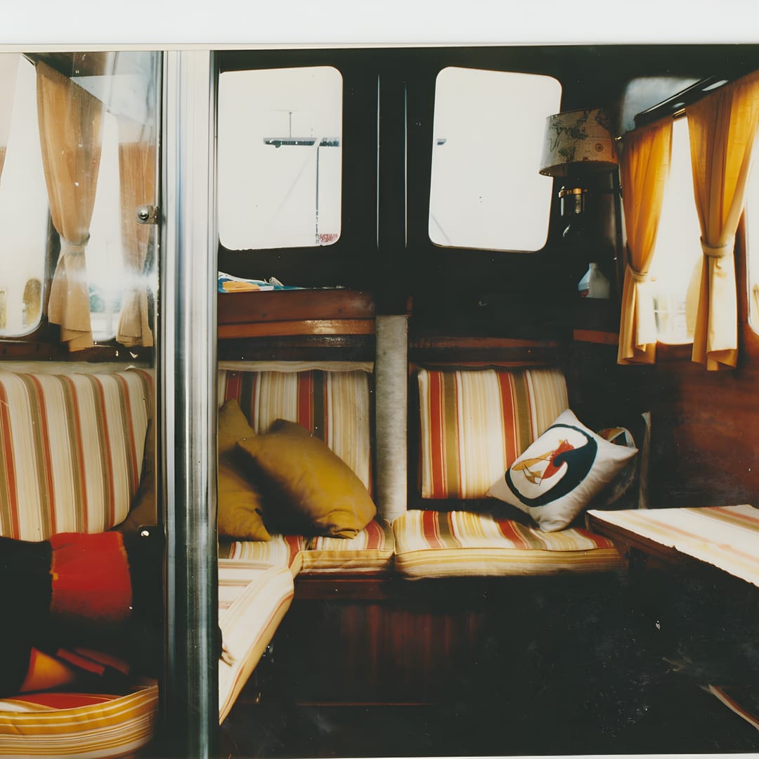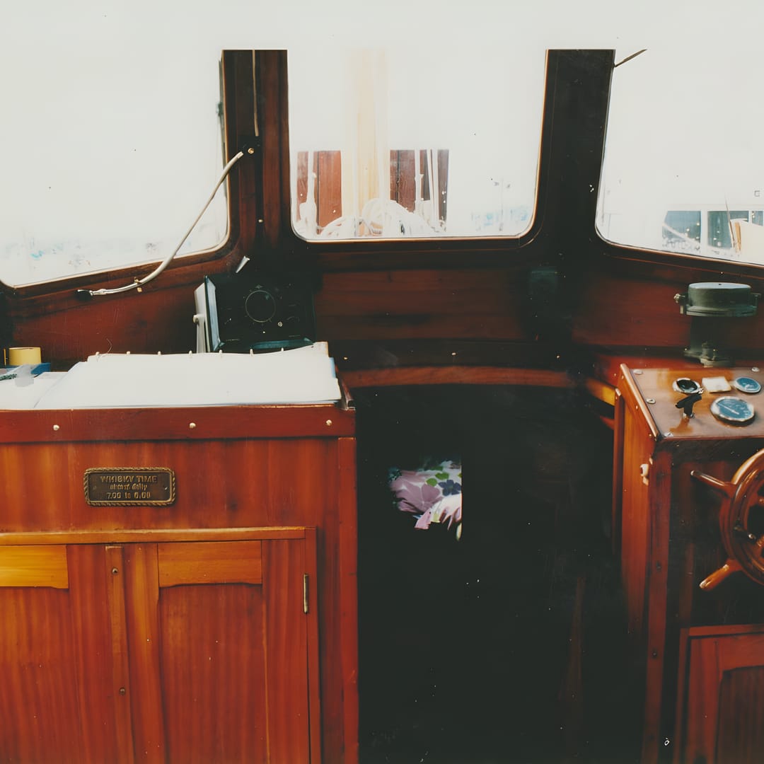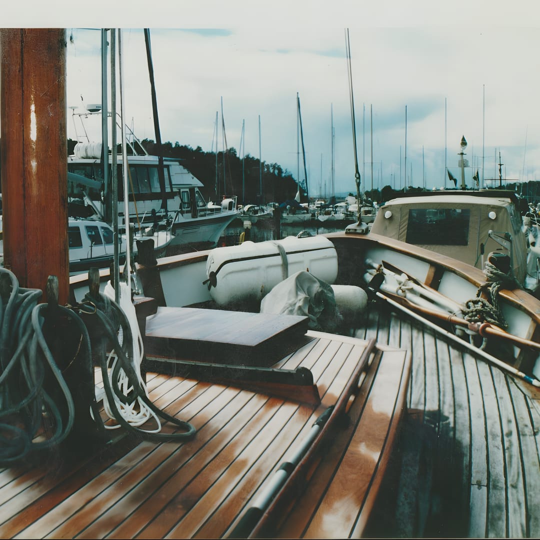Корпус построен по технологии карвельной обшивки — махагони по дубу — на верфи Hansen & Arntzen. Это значит, что доски крепятся встык, а поверхность корпуса получается гладкой, как у современных яхт.