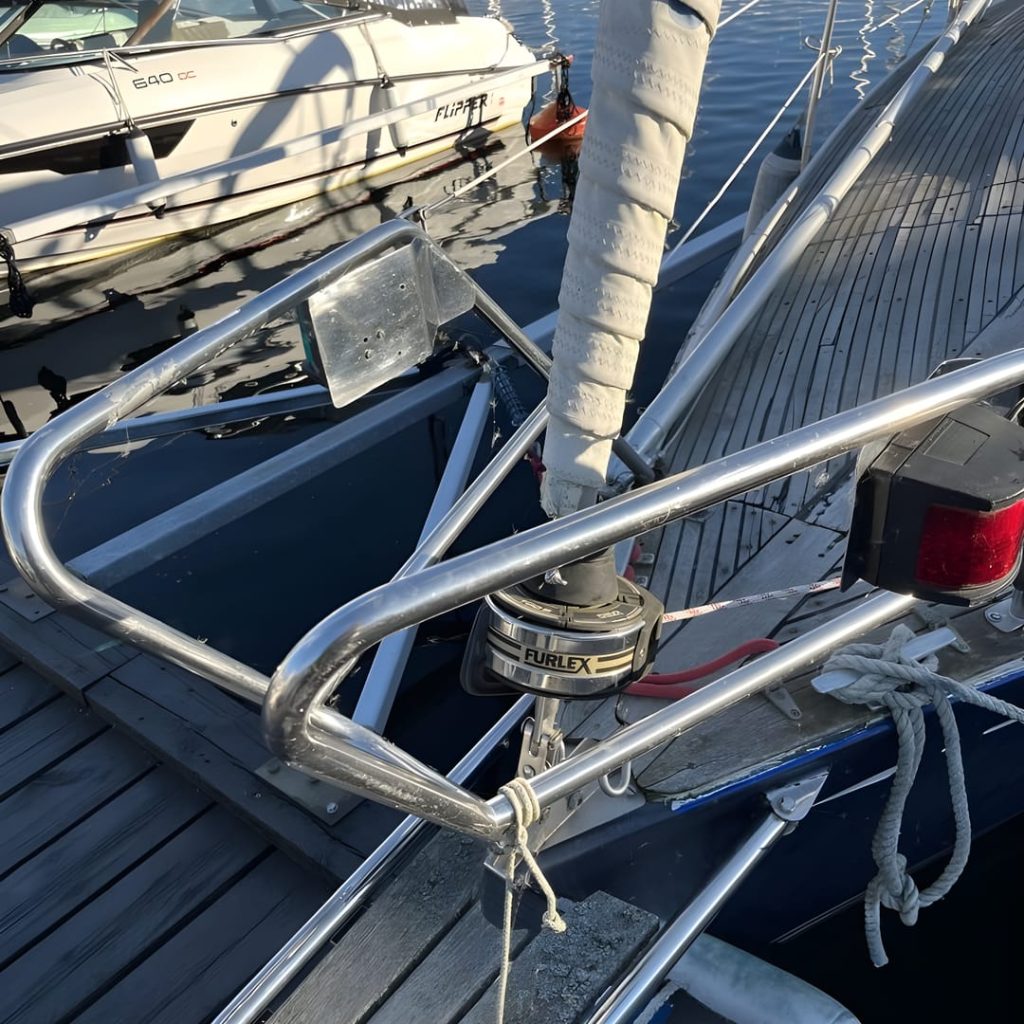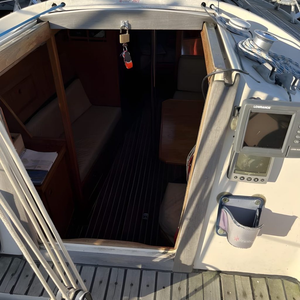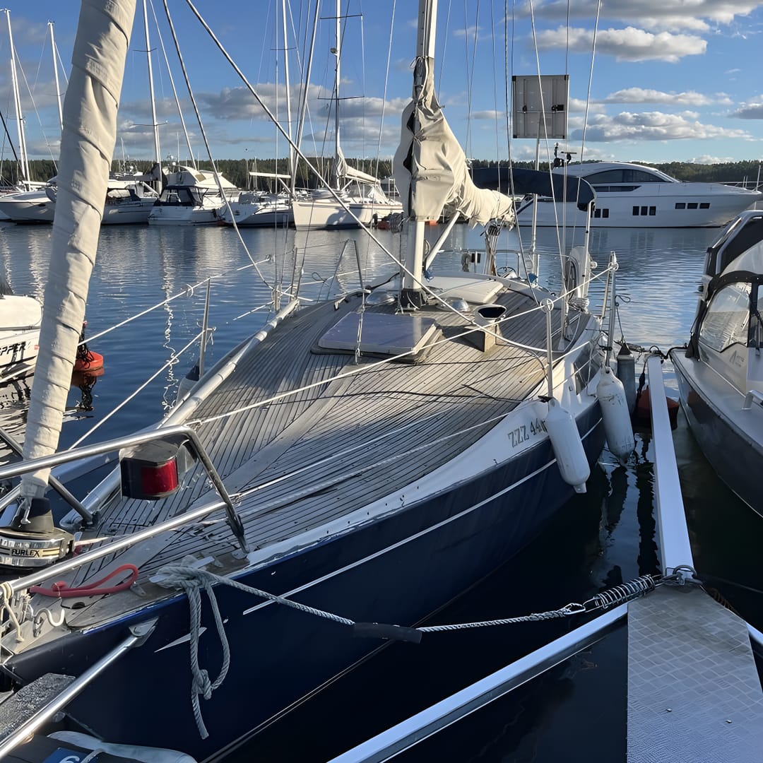 Мотор Sole обслужен на 2025 год, что для таких лет — огромный плюс. Состояние парусов радует: грот с полными латами, генуя и спинакер, все паруса прошли сервис в Atta Segel. В 2021 году были заменены все шкоты, установлен новый стоячий такелаж и lazyjacks.