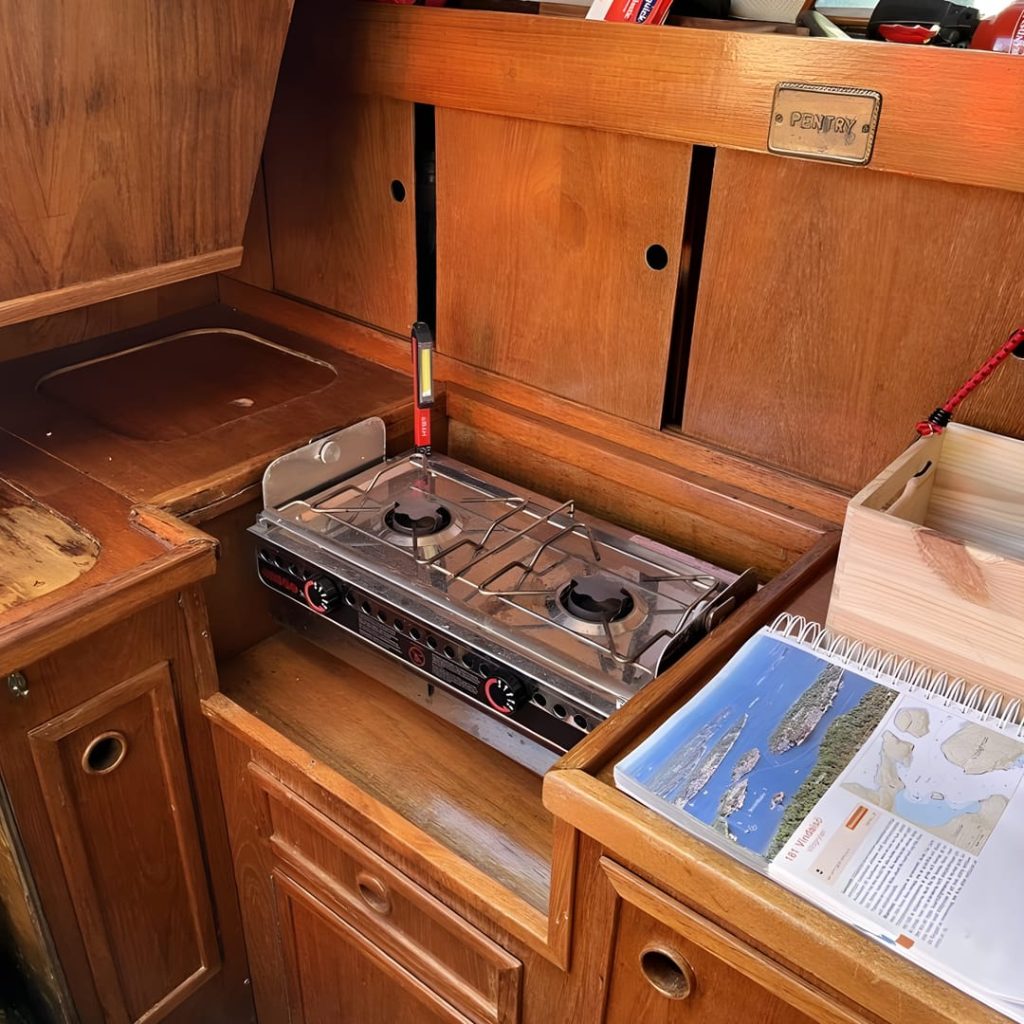 Электроника и навигация — на борту Simrad автопилот, VHF, Garmin (глубина, скорость, ветер), Lowrance картплоттер с эхолотом и солнечная панель на 55 Вт. Для автономного плавания есть бак пресной воды на 50 литров и Origo спиртовая плита.