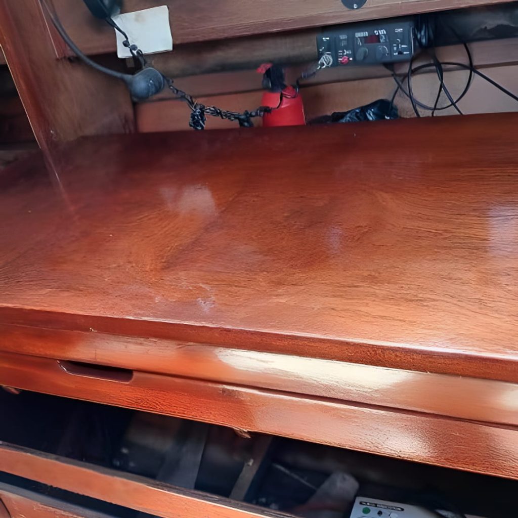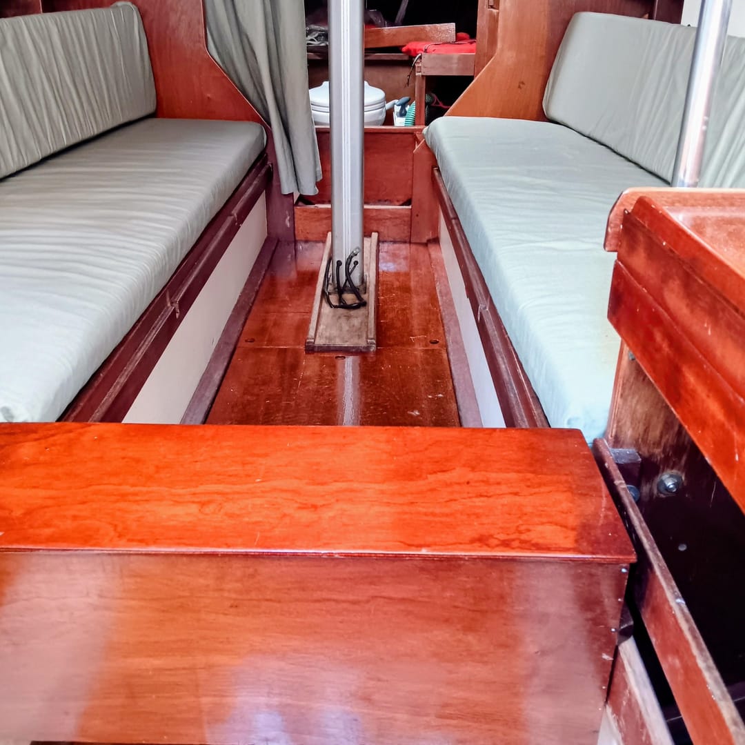 Внутри — аккуратный деревянный интерьер с чистыми подушками. Новый туалет, дизельная отопительная система Webasto и рабочая электроника — всё для простых выходов на воду.
