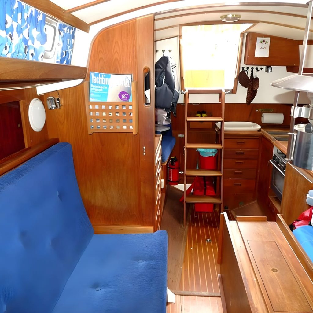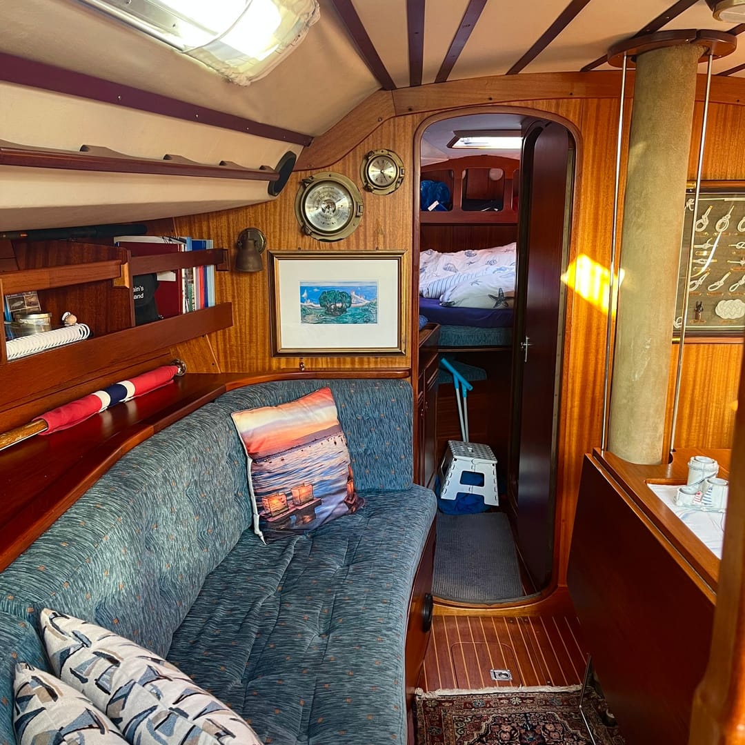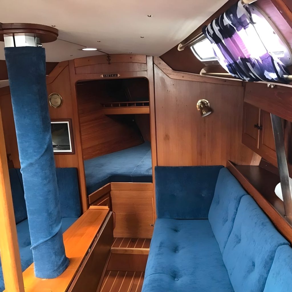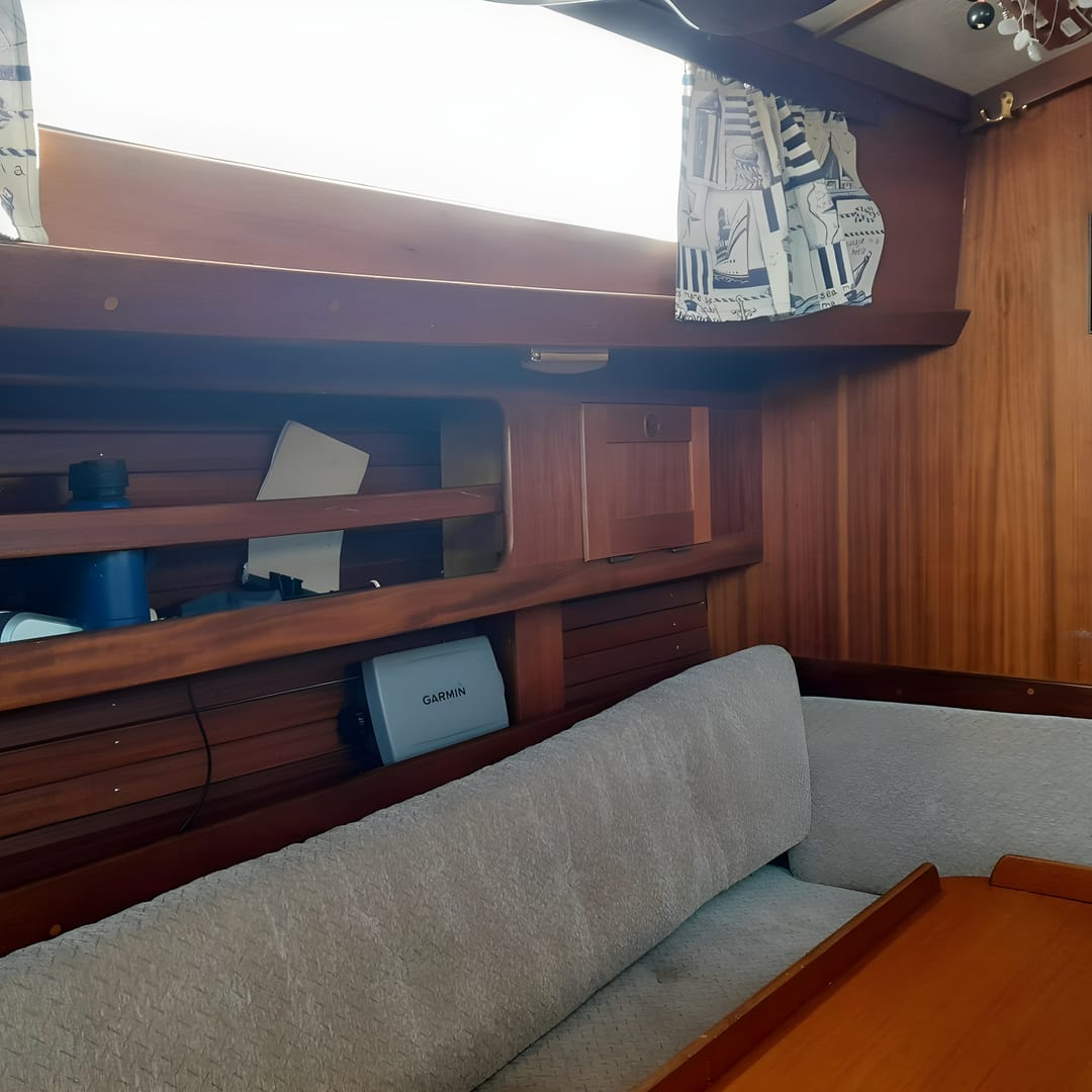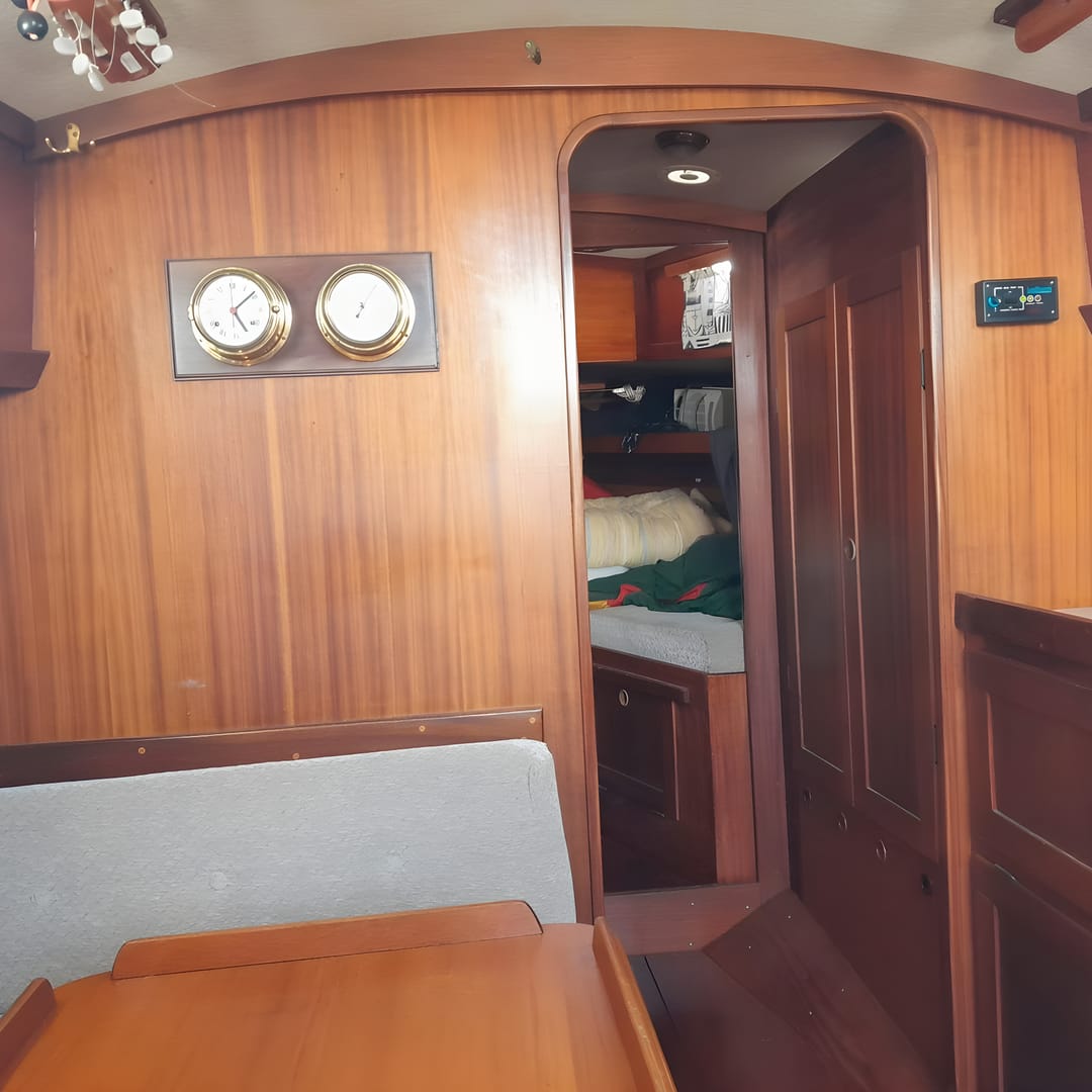 Внутри уютно: отделка из краснухи, просторный камбуз, новый компрессор для холодильника Isotherm (2024 г.), плита с двумя конфорками и духовкой, тёплый душ в кокпите, отопитель Eberspächer (нужен сервис, это учтено в цене).