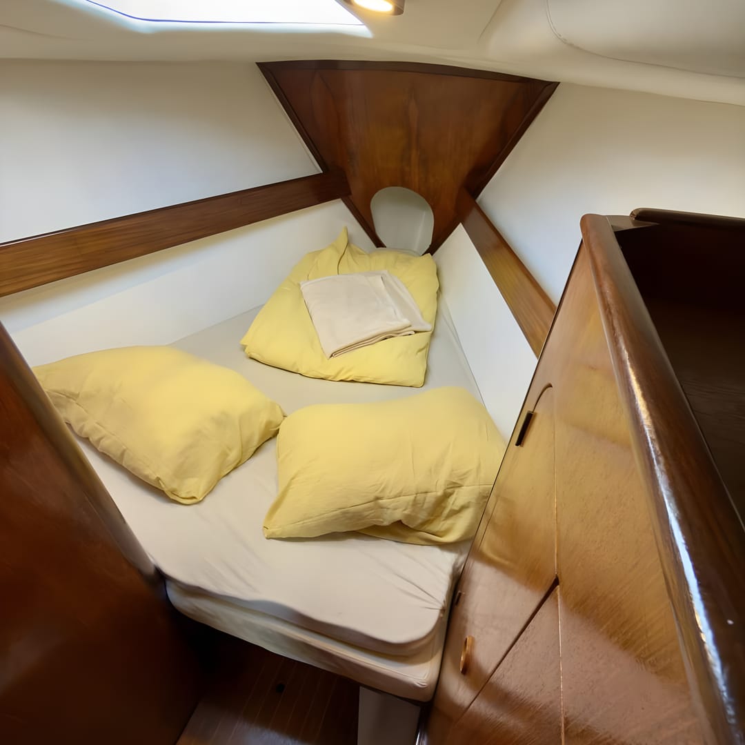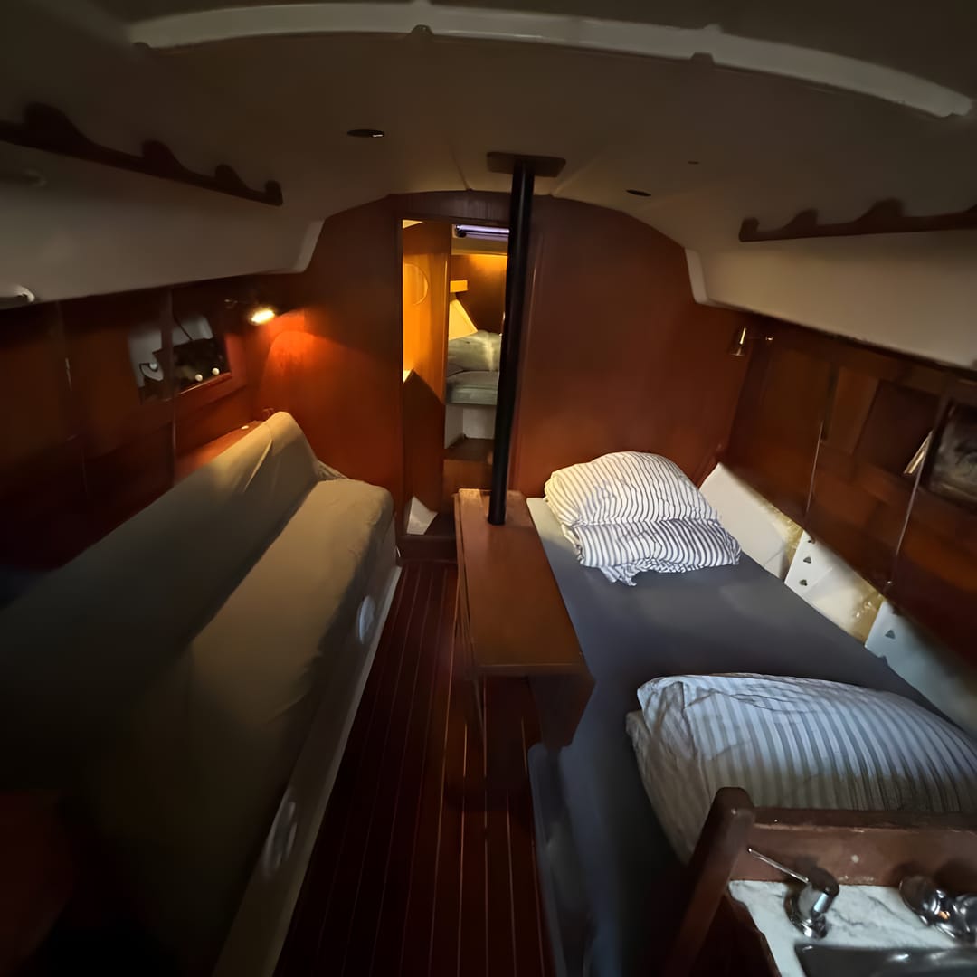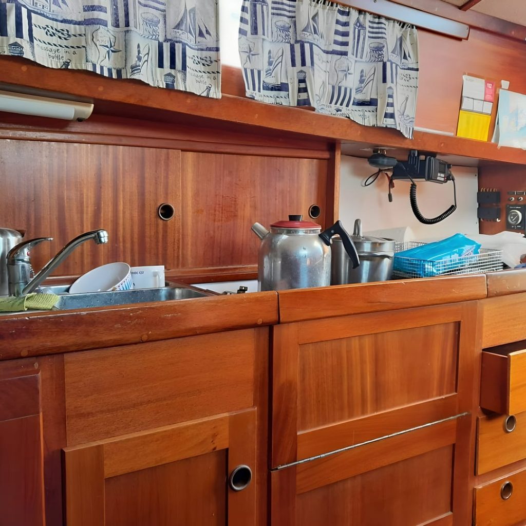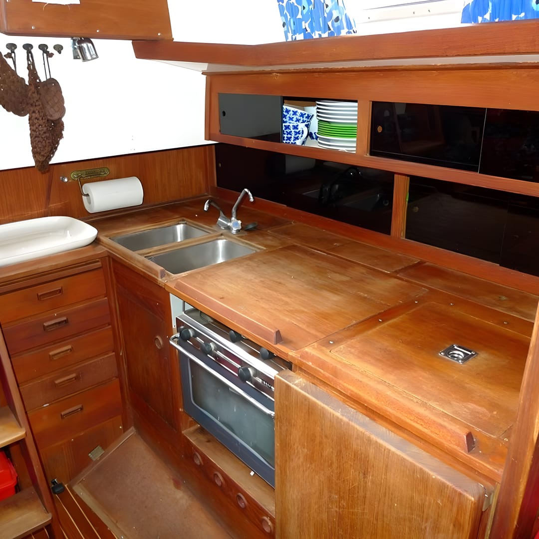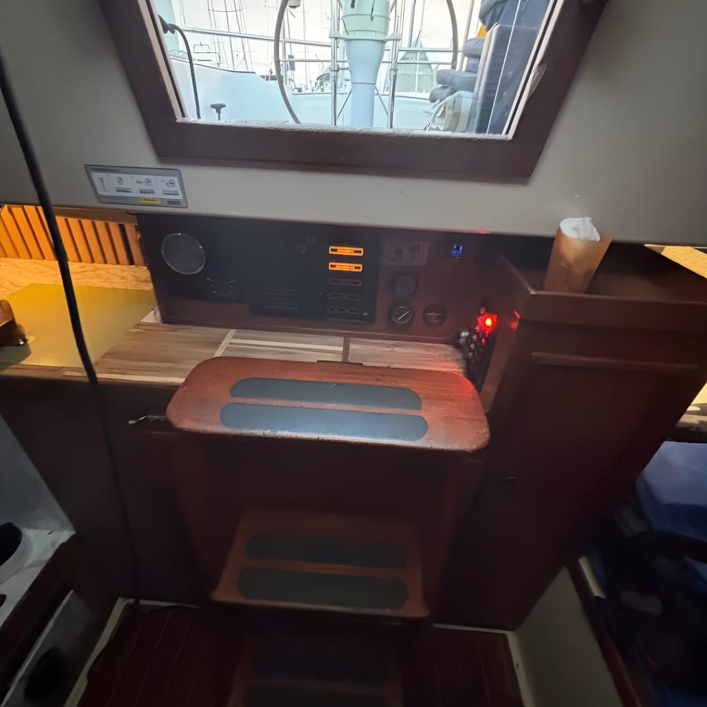 Внутри уютно: отделка из краснухи, просторный камбуз, новый компрессор для холодильника Isotherm (2024 г.), плита с двумя конфорками и духовкой, тёплый душ в кокпите, отопитель Eberspächer (нужен сервис, это учтено в цене).