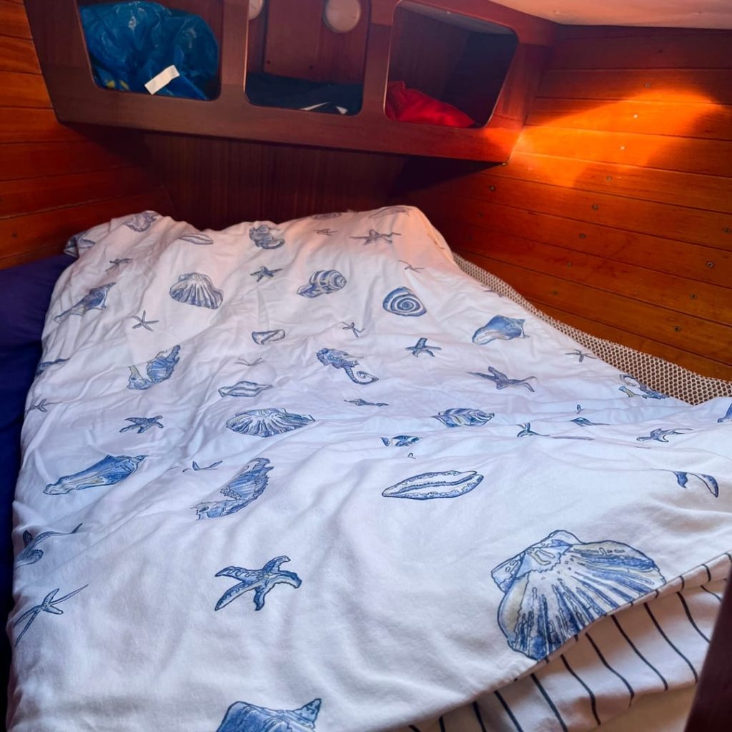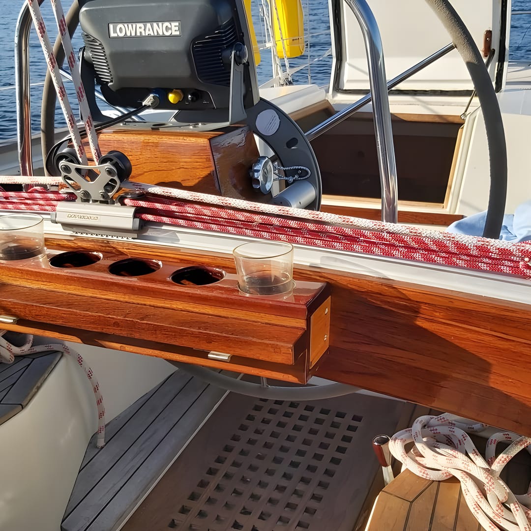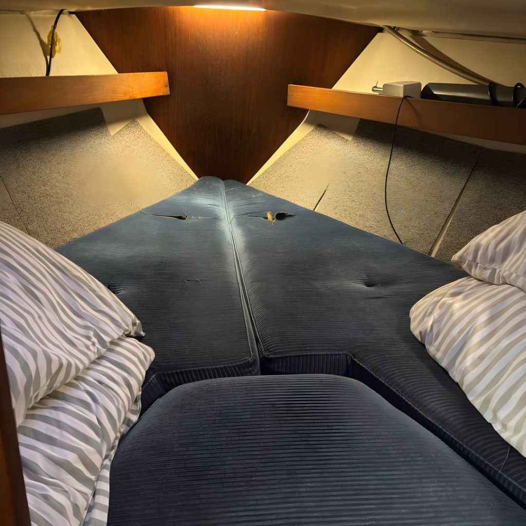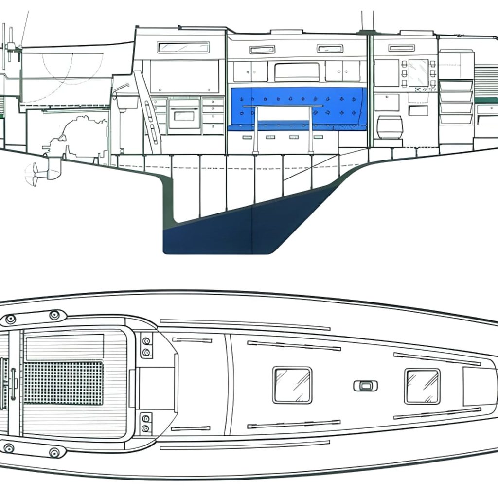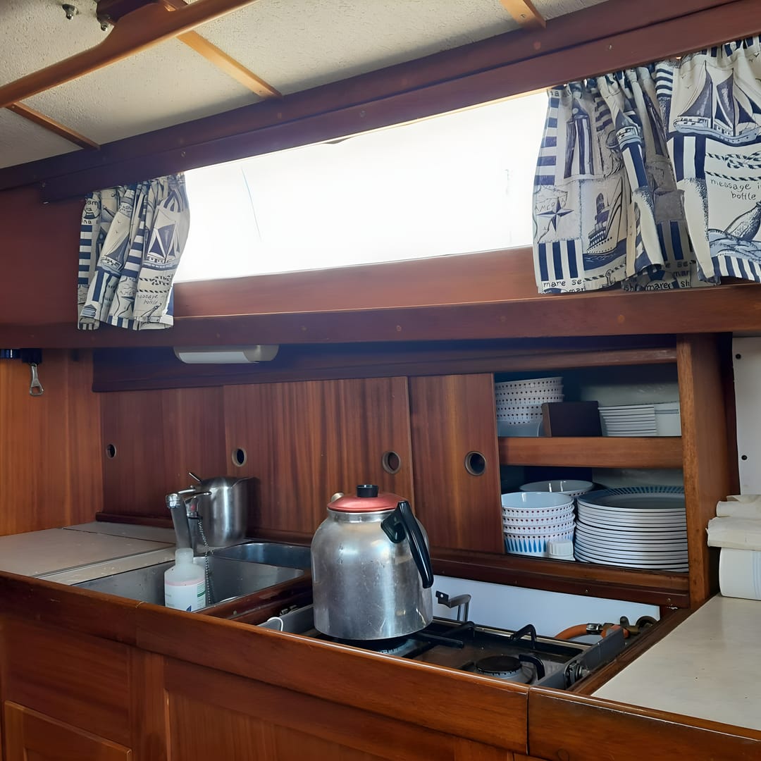 Внутри уютно: отделка из краснухи, просторный камбуз, новый компрессор для холодильника Isotherm (2024 г.), плита с двумя конфорками и духовкой, тёплый душ в кокпите, отопитель Eberspächer (нужен сервис, это учтено в цене).