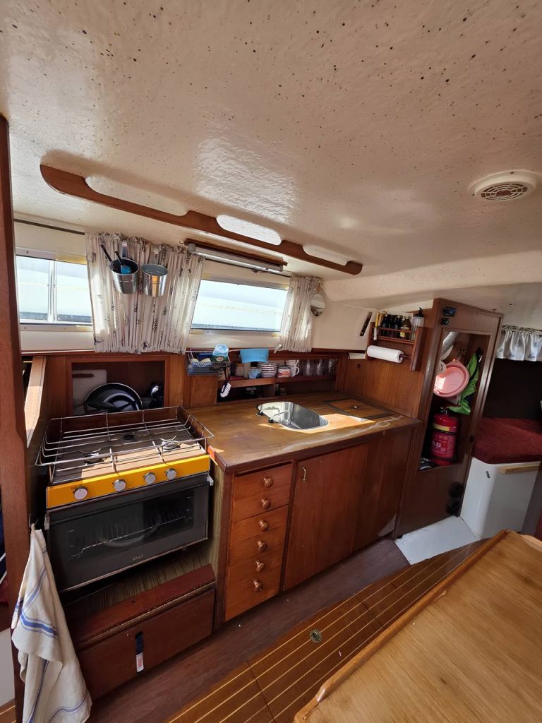 Интерьер чистый и уютный: просторный салон с обеденной зоной, камбуз с газовой плитой и холодильником и частично выделенным туалетом. Всё продумано для комфортных выходов на воду и коротких круизов.